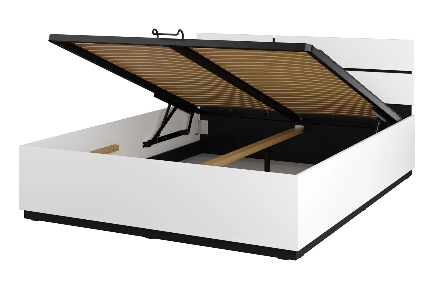 Meble zostały wykonane z wysokiej jakości płyty laminowanej o grubości 15mm, która charakteryzuje się odpornością na wpływ czynników zewnętrznych takich jak obicia, uderzenia i niefortunne zadrapania. Nietuzinkowym wykończeniem frontów mebli są subtelnie frezowane uchwyty. Precyzyjne wykończenie i dbałość o detale sprawiają, że zestaw mebli do sypialni Cross zachowa swój piękny wygląd na wiele lat, nie tracąc przy tym na funkcjonalności. Łóżko wyposażone jest w stabilny metalowy stelaż oraz praktyczny pojemnik na pościel. Łatwe i lekkie otwieranie ramy z materacem zapewniają podnośniki gazowe.