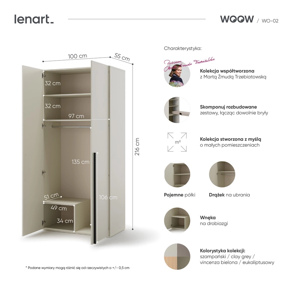 Szafa na ubrania Woow pomoże w uprządkowaniu ubrań, akcesoriów oraz wszystkich niezbędnych rzeczy w pokoju, dodatkowo czyniąc wnętrze lepiej zorganizowanym. Obecność szafy stanie się stylowym wykończeniem pokoju młodzieżowego i nieco starszego dziecka, nadając mu charakteru i niepowtarzalnego klimatu. Designerski styl to zasługa modnych, oryginalnych kolorów i nieoczywistej formy, które dodają wnętrzu estetycznego wyglądu, a także industrialnego klimatu. Kolekcja mebli Woow wyróżnia się możliwością łączenia brył w różne zestawy i daje szerokie pole manewru w kwestii aranżacji wnętrza.