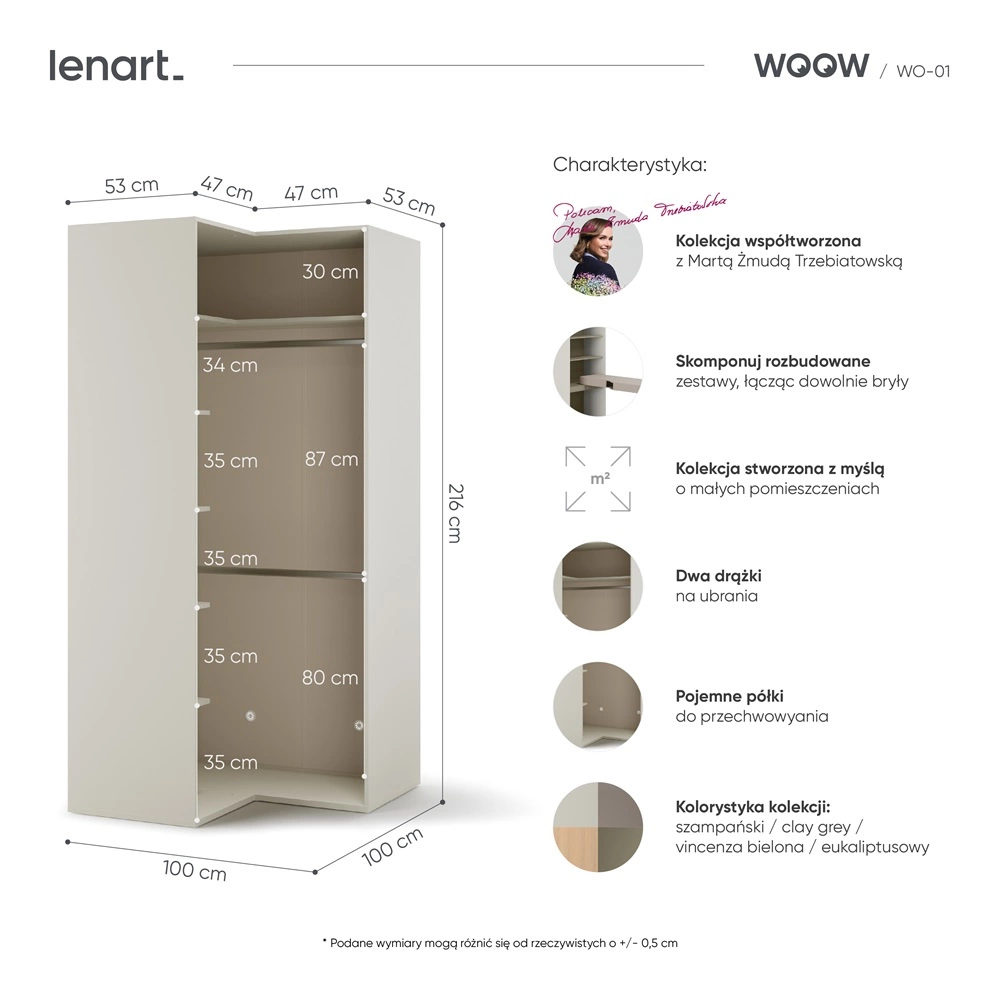 Szafa narożna Woow szampańska nowoczesny wygląd szafy z dwoma drążkami na ubrania wiszące modna i lekka kolorystyka