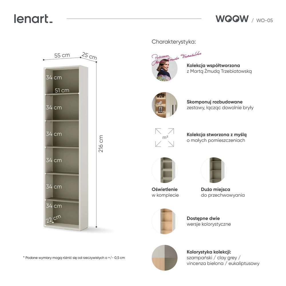 Regał Woow 55 cm szampański / eukaliptus wąski regał z funkcjonalnym oświetleniem doskonały dodatek do pokoju nastolatka