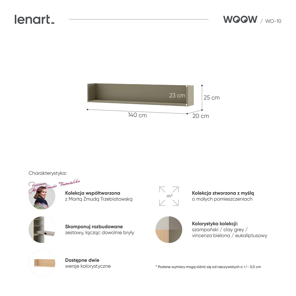 Solidne i staranne wykończenie sprawia, że mebel będzie służyć przez wiele lat, zachowując swoją funkcjonalność i estetykę. Modny eukaliptusowy kolor sprawia, że półka ścienna Woow świetnie sprawdzi się w roli półki na książki, półki do sypialni lub półki do pokoju dziecięcego.