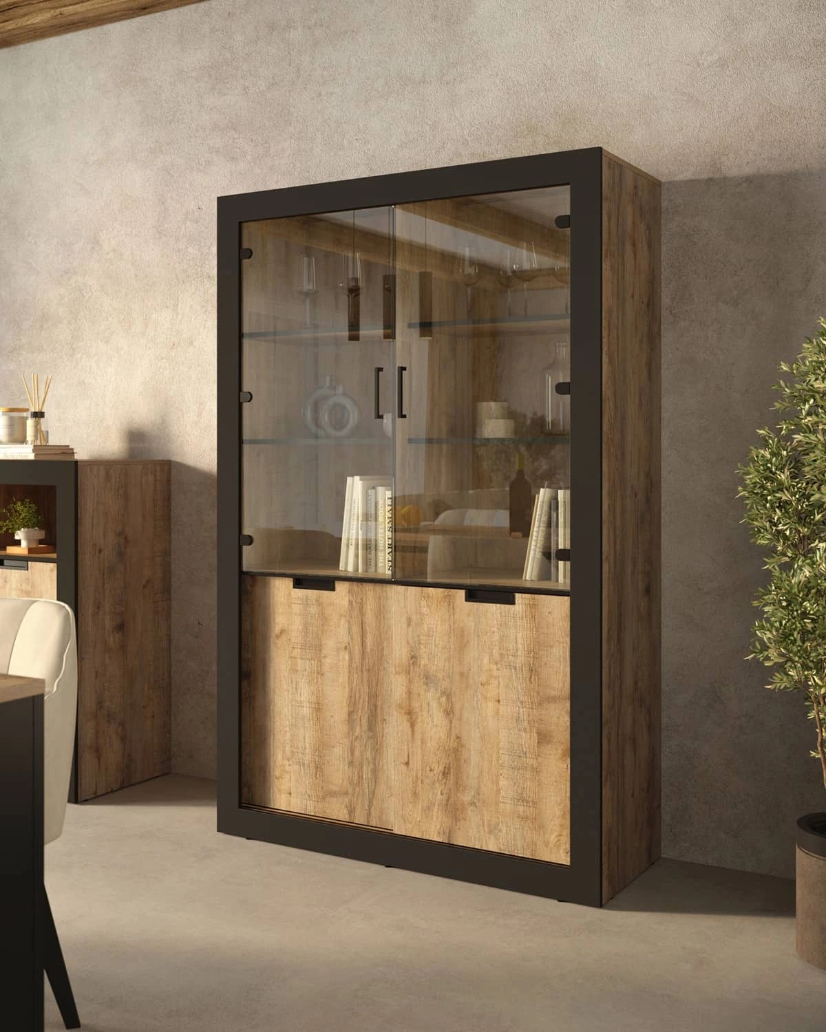 - Witryna Tudor to idealny mebel do nowoczesnych wnętrz w jasnych barwach, jak i bardziej stonowanych, industrialnych aranżacji. Dębowa bryła w połączeniu z czarnymi elementami dekoracyjnymi sprawia, że całość prezentuje się niezwykle stylowo.