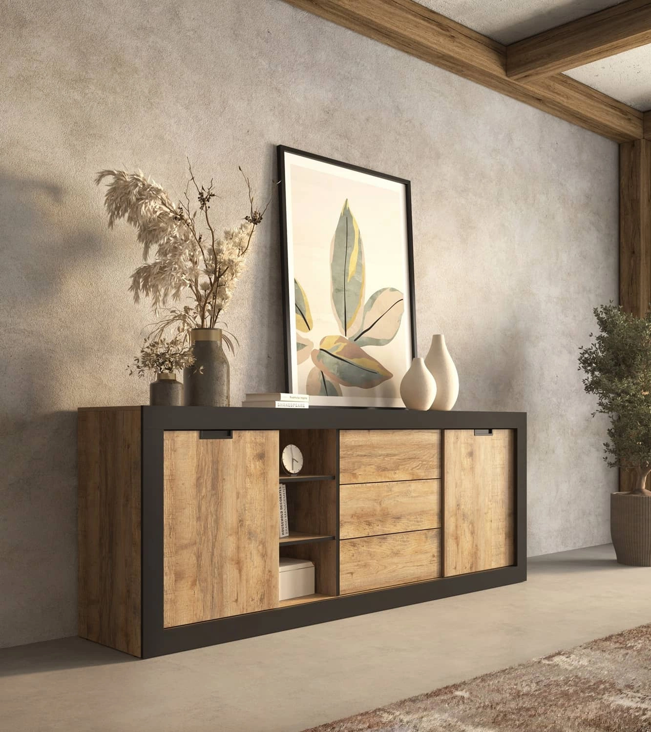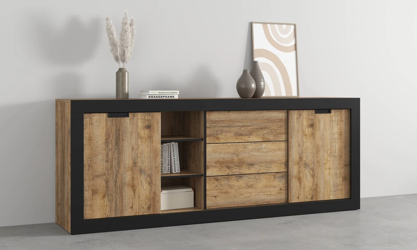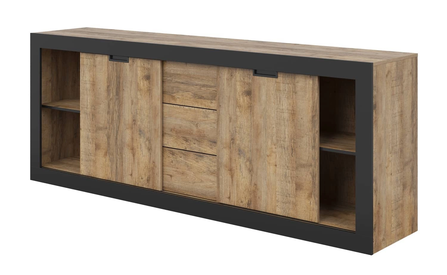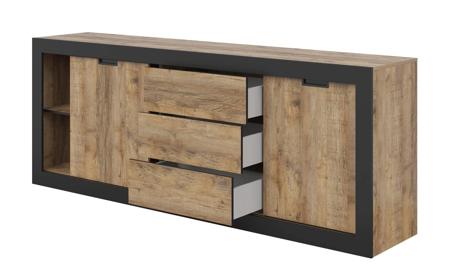 Komoda z szufladami Tudor 220 cm dąb samdal / czarny z drzwiami przesuwnymi idealna do wnętrz w stylu industrialnym bezuchwytowy system push to open