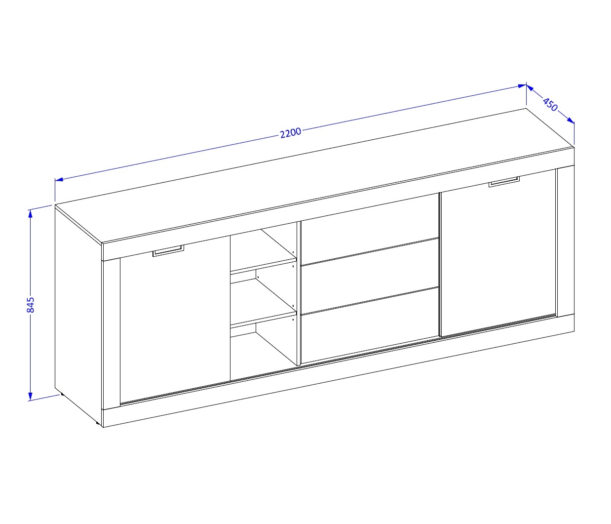 Komoda jest skonstruowana z 3 szuflad, 2 drzwi przesuwnych z wpuszczonymi uchwytami oraz półek otwartych. Komoda z szufladami wykonana została z wysokiej jakości płyty laminowanej o grubości 15mm, która charakteryzuje się odpornością na wpływ czynników zewnętrznych takich jak obicia, uderzenia i niefortunne zadrapania. Dzięki prostej formie oraz uniwersalności komoda z szufladami Tudor świetnie sprawdzi się w roli komody do salonu o nowoczesnym wykończeniu, komody do pokoju dziennego lub komody do sypialni w stylu industrialnym. Komoda nowoczesna z powodzeniem odnajdzie się także jako mebel biurowy.