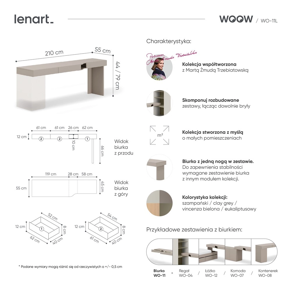 Meble wykonane zostały z wysokiej jakości płyty laminowanej, która charakteryzuje się odpornością na wpływ czynników zewnętrznych takich jak obicia, uderzenia i niefortunne zadrapania. Solidne i staranne wykończenie sprawia, że meble będą służyć przez wiele lat, zachowując swoją funkcjonalność i estetykę. Beżowy z szarym odcieniem sprawia, że meble Woow świetnie sprawdzą się jako zestaw mebli do pokoju dziecka lub zestaw mebli do sypialni nastolatka.