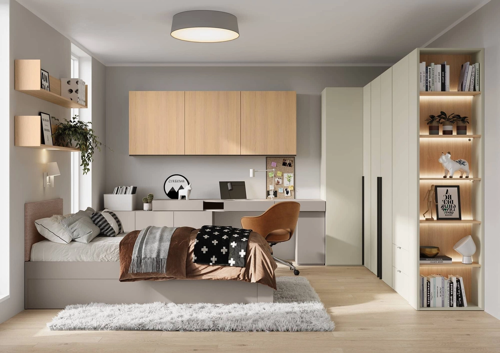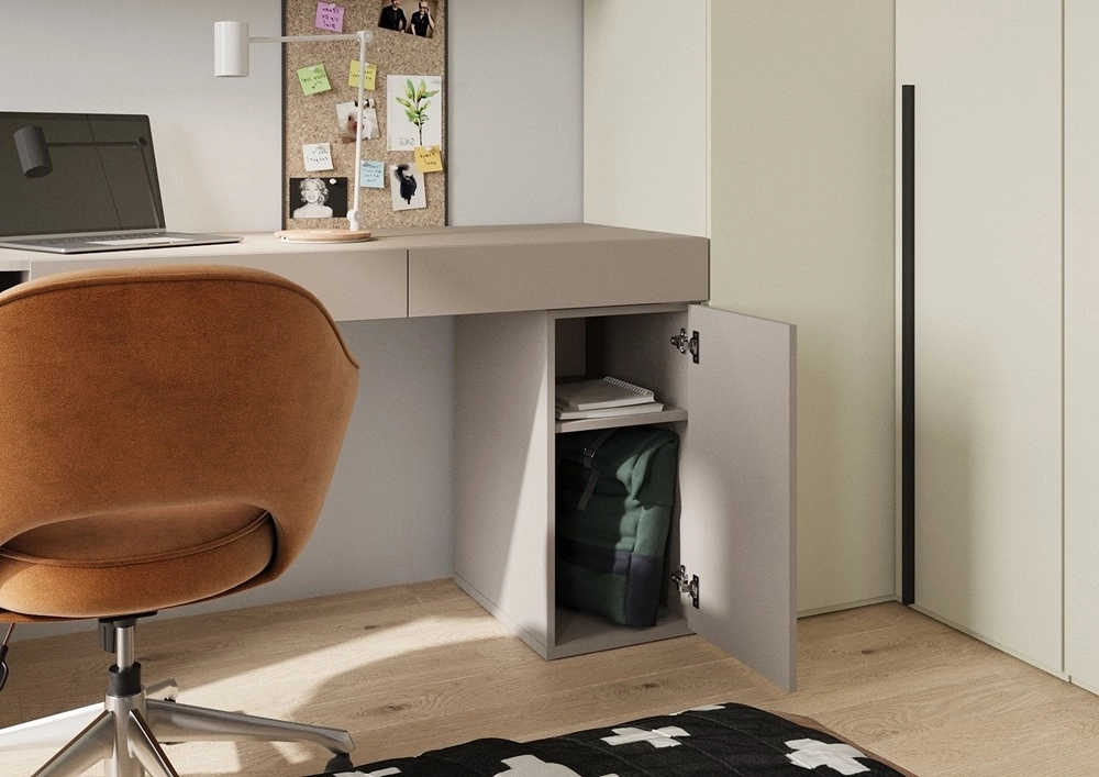 Blat biurka o odpowiedniej szerokości pomieści laptopa, książki i niezbędne organizery. Dodatkowe szuflady oraz praktyczna wnęka na akcesoria pomagają utrzymać porządek i ułatwiają codzienną naukę. Kontenerek oraz komoda została zaprojektowana w sposób funkcjonalny i użytkowy, oferując dużo miejsca do przechowywania. Dodatkowym atutem mebli są bezuchwytowe fronty, które uwydatniają minimalistyczny design.