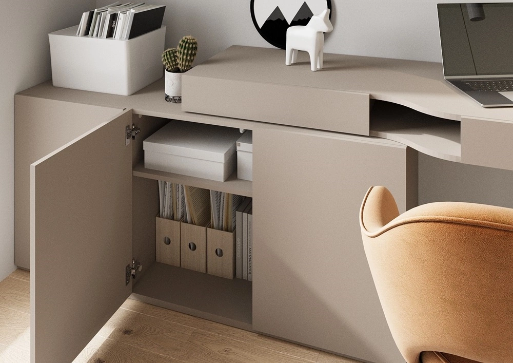 Meble wykonane zostały z wysokiej jakości płyty laminowanej, która charakteryzuje się odpornością na wpływ czynników zewnętrznych takich jak obicia, uderzenia i niefortunne zadrapania. Solidne i staranne wykończenie sprawia, że meble będą służyć przez wiele lat, zachowując swoją funkcjonalność i estetykę. Beżowy z szarym odcieniem sprawia, że biurka nowoczesne Woow świetnie sprawdzą się jako biurka do biura domowego lub biurka dla dzieci. Elementy zestawu mebli są uniwersalne, można je dopasować do układu wnętrza. Dzięki możliwości obustronnego montażu biurko z kontenerkiem i komodą można ustawić w wielu miejscach, dostosowując je do własnych preferencji aranżacyjnych.