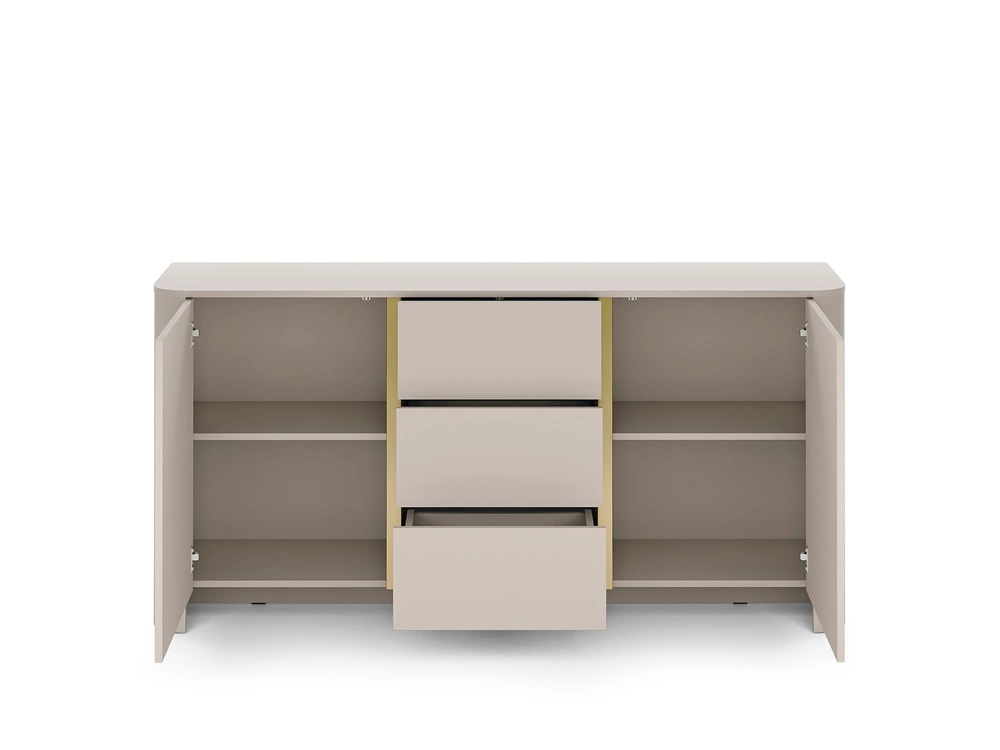• Komoda Bari wyróżnia się nowoczesnym designem, który łączy elegancję z funkcjonalnością. Zaokrąglone krawędzie dodają harmonii, a wysokie nogi sprawiają, że mebel prezentuje się niezwykle lekko. Złote obrzeża na przegrodzie nadaje niepowtarzalnego stylu.