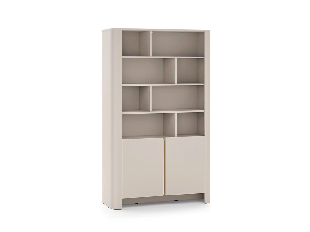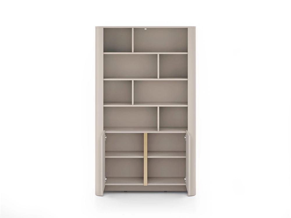 Regał Bari to nie tylko funkcjonalny mebel, ale także elegancki element wystroju wnętrza. Unikalne, zaokrąglone krawędzie regału oraz front o gładkim wykończeniu nadają pomieszczeniu harmonii, a także sprawiają, że cała konstrukcja wygląda bardzo modnie. Niezwykłe połączenie beżu w kaszmirowym odcieniu ze złotym obrzeżem na przegrodzie tworzy stylowy kontrast. Wysoka podstawa to nie tylko stylowy dodatek, ale również bardzo praktyczny element wykończenia regału Bari. Ten designerski regał stanie się centralnym punktem salonu, przyciągając wzrok i podkreślając styl aranżacji.
