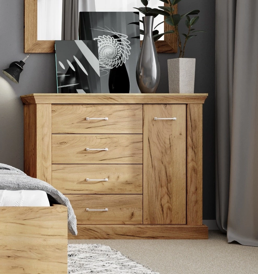 Komoda do salonu skonstruowana jest z 1 drzwi oraz 4 szuflad. Drzwi posiadają systemem cichego domykania. Zastosowany system zwiększa komfort i bezpieczeństwo użytkowania mebli. Komoda do salonu gwarantuje komfortowe i bezproblemowe korzystanie oraz trwałość całego mebla przez wiele lat użytkowania. Ciepłe wybarwienie dębu nada pomieszczeniu lekkości i przytulnego klimatu, dzięki czemu komoda z szufladami Antica świetnie sprawdzi się w roli komody do salonu lub komody do pokoju dziennego. Komoda z powodzeniem odnajdzie się także jako mebel biurowy lub komoda do sypialni.