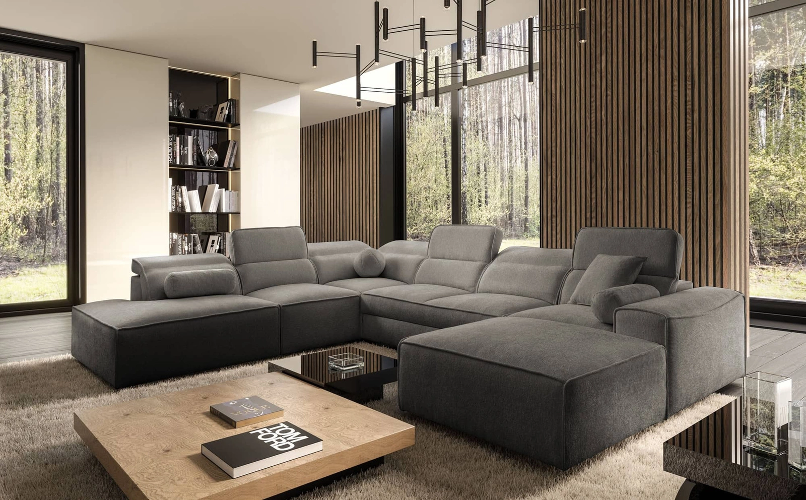 Narożnik z funkcją spania Viano X szary prawostronny designerski narożnik do salonu w nowoczesnym stylu regulowane zagłówki