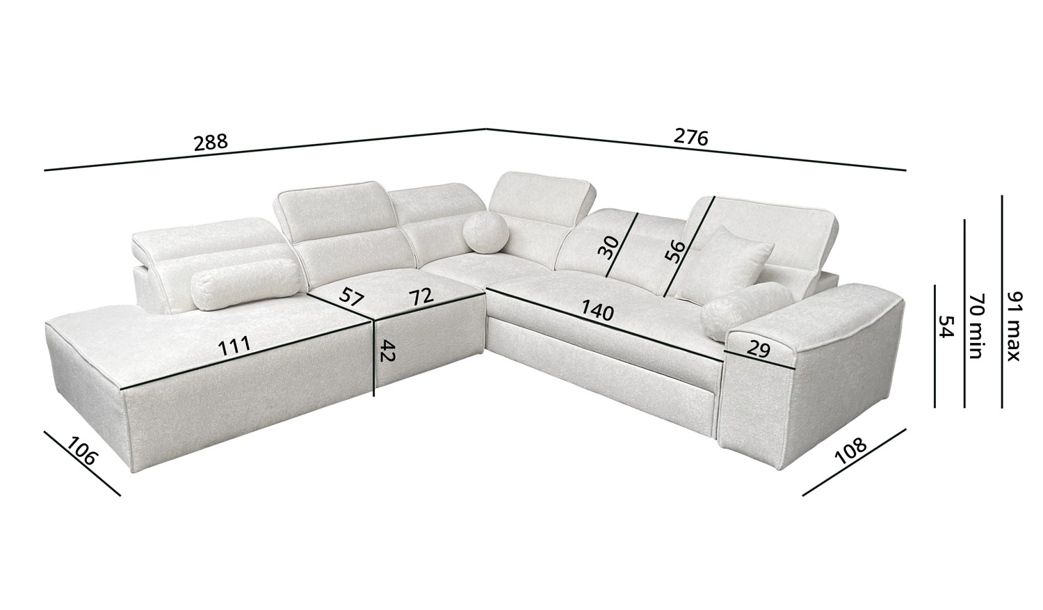 Wymiary mebla pozwolą na zagospodarowanie przestrzeni w przestronnym salonie lub pokoju dziennym. Szerokość narożnika 276 cm, wysokość 91 cm oraz głębokość 288 cm. Powierzchnia spania narożnika wynosi 127x198 cm. Wysokość siedziska mebla to 42 cm a wysokość oparcia wynosi 56 cm. Sprężyny faliste oraz pianka poliuretanowa T30 to materiał, z którego wykonane zostało siedzisko narożnika. Oparcie stałe z regulowanymi zagłówkami pozwoli na łatwe dostosowanie kąta nachylenia zagłówków do swoich preferencji oraz daje gwarancję wygodnego wypoczynku po długim dniu, które docenisz Ty, Twoi bliscy a także goście, którzy zasiądą na tym wyjątkowym narożniku.