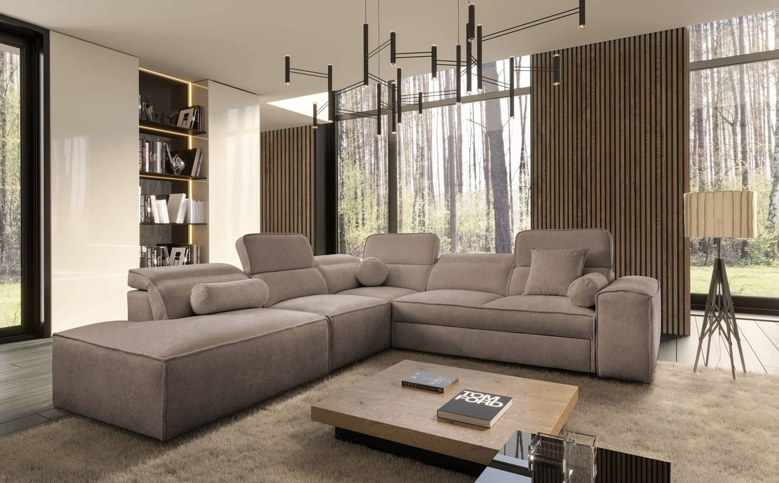 Narożnik z funkcją spania Viano IX jasny brąz lewostronny stylowy narożnik z pojemnikami na pościel idealny mebel do dużego salonu
