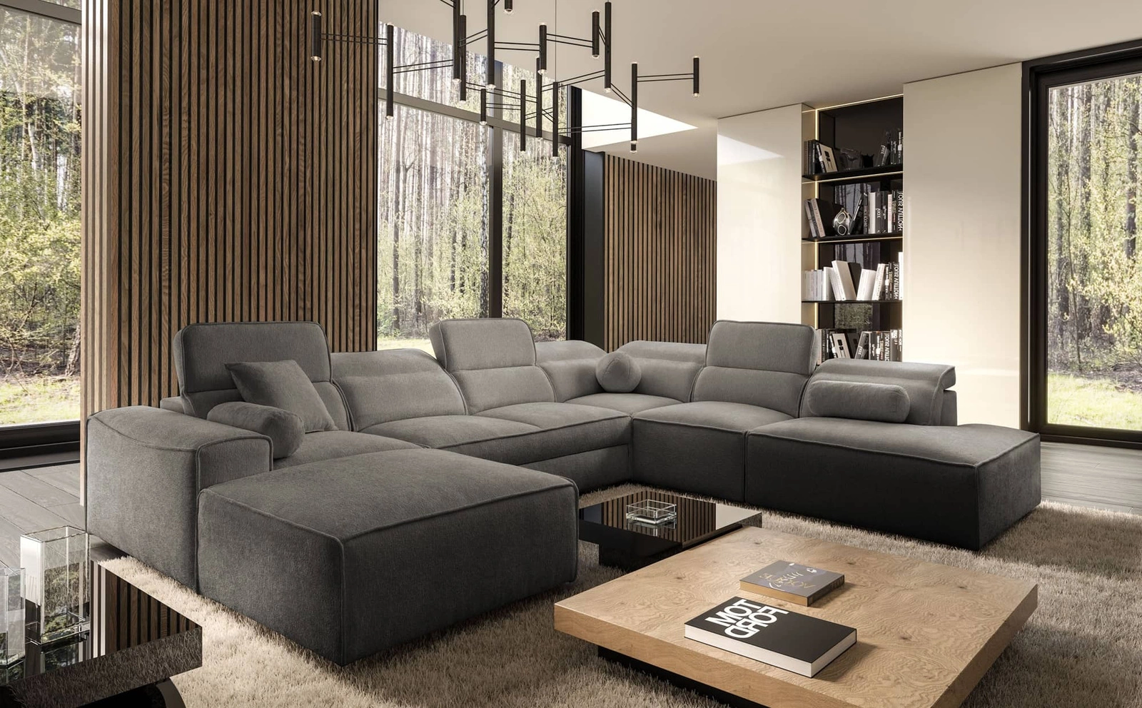Narożnik z funkcją spania Viano X szary lewostronny designerski narożnik do salonu w nowoczesnym stylu regulowane zagłówki