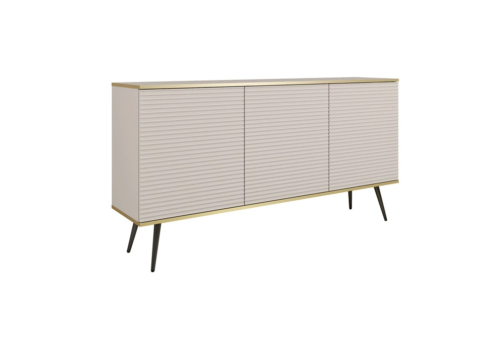 Komoda Luxury 160 cm beżowa elegancki design stylowe ryflowane fronty korpus komody zwieńczony złotą listwą czarne metalowe nogi