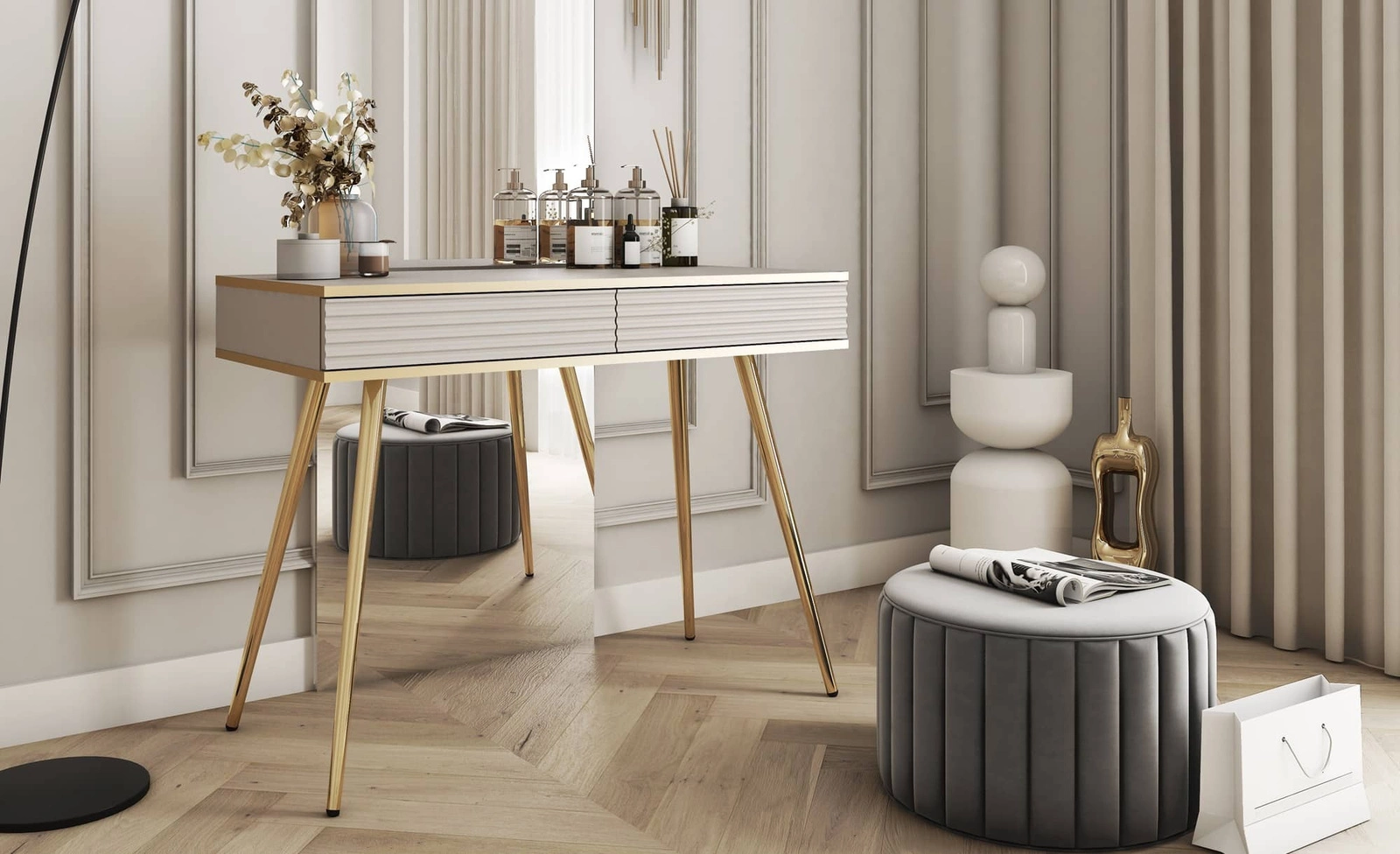 Konsola Luxury beżowa z szufladami elegancka toaletka z ryflowanymi frontami wysokie złote nogi korpus zwieńczony złotą listwą