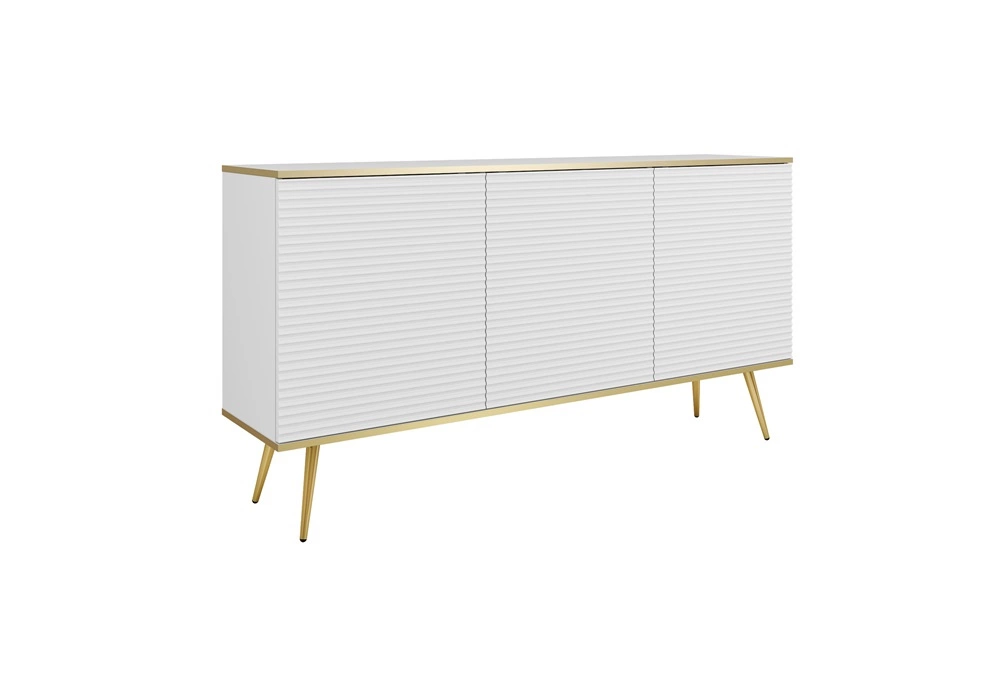 Komoda Luxury 160 cm biała elegancki design stylowe ryflowane fronty korpus komody zwieńczony złotą listwą złote metalowe nogi