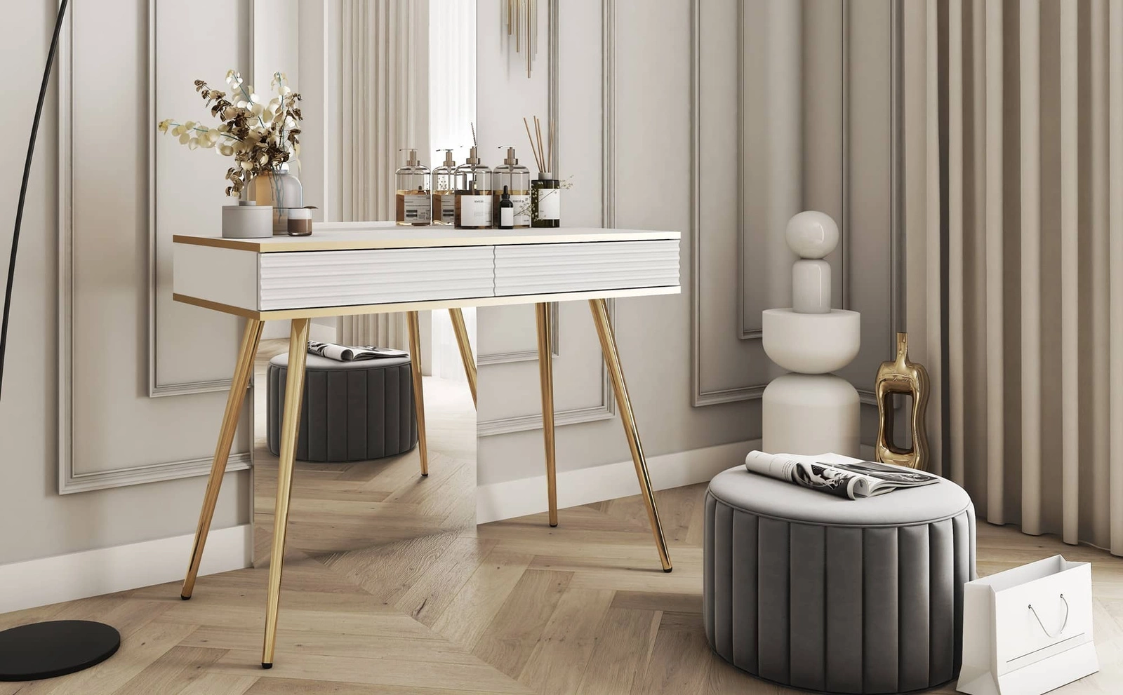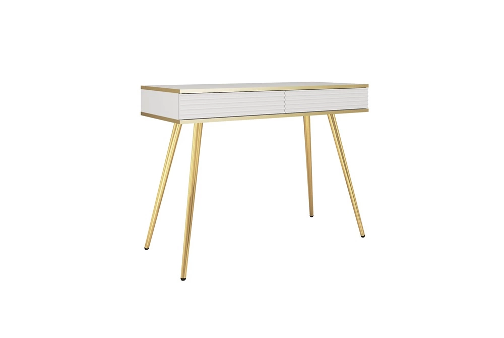 Konsola Luxury biała z szufladami elegancka toaletka z ryflowanymi frontami wysokie złote nogi korpus zwieńczony złotą listwą