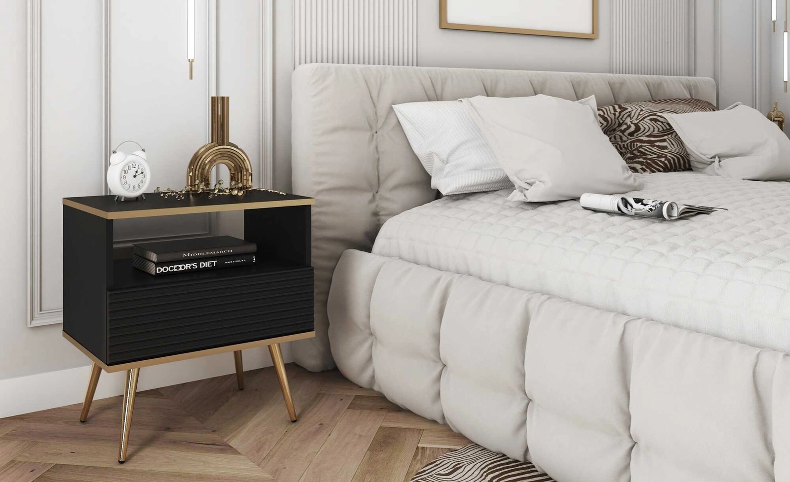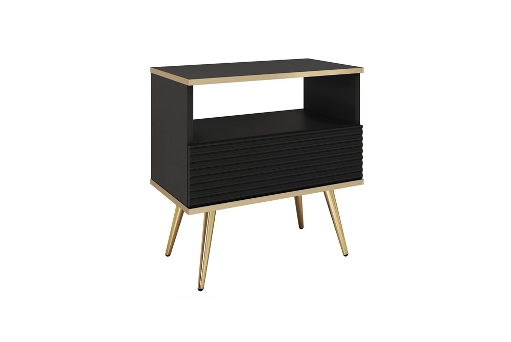 Szafka nocna z szufladą Luxury czarna elegancki design korpus zwieńczony złotą listwą szafka z ryflowanym frontem złote wysokie nogi