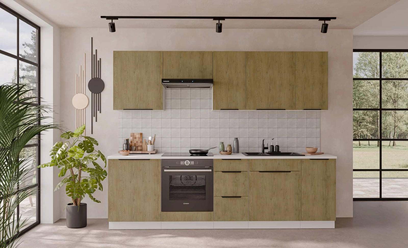 Zestaw mebli kuchennych Cremona 260 cm eleganckie szafki kuchenne o subtelnej i naturalnej kolorystyce metalowe uchwyty krawędziowe