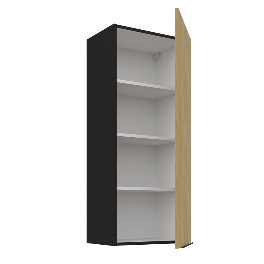 Trzy półki szafki kuchennej można wyciągnąć i uzyskać miejsce na wysokie przedmioty. Drzwi są uniwersalne i można je zamontować po prawej lub po lewej stronie. Standardowym wyposażeniem szafki kuchennej są zawiasy z systemem cichego domykania. Spowalniacze zwiększają komfort i bezpieczeństwo użytkowania mebli.