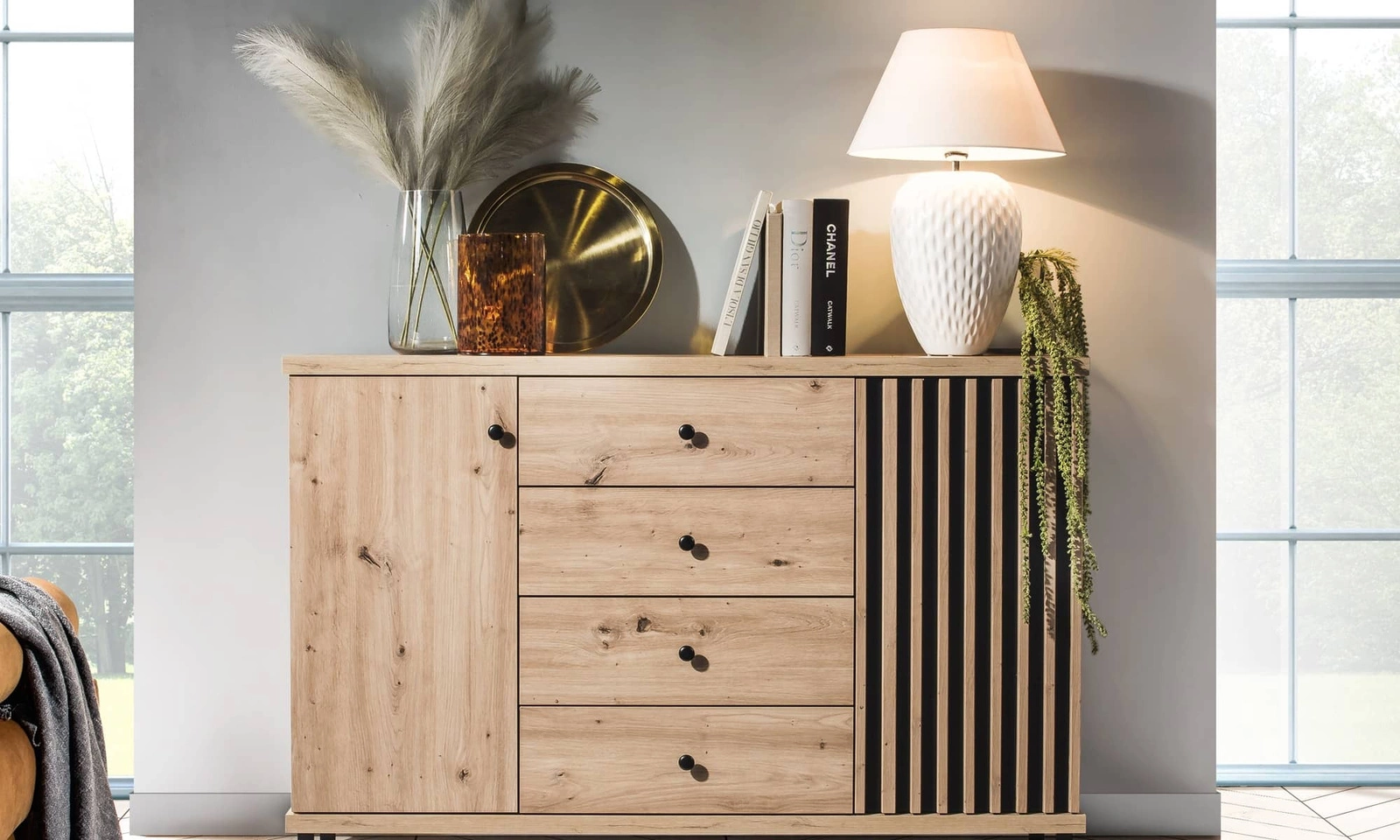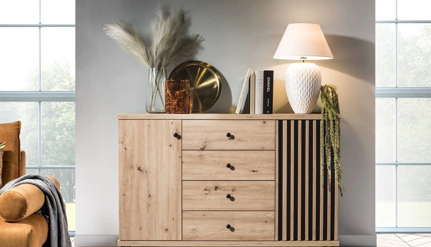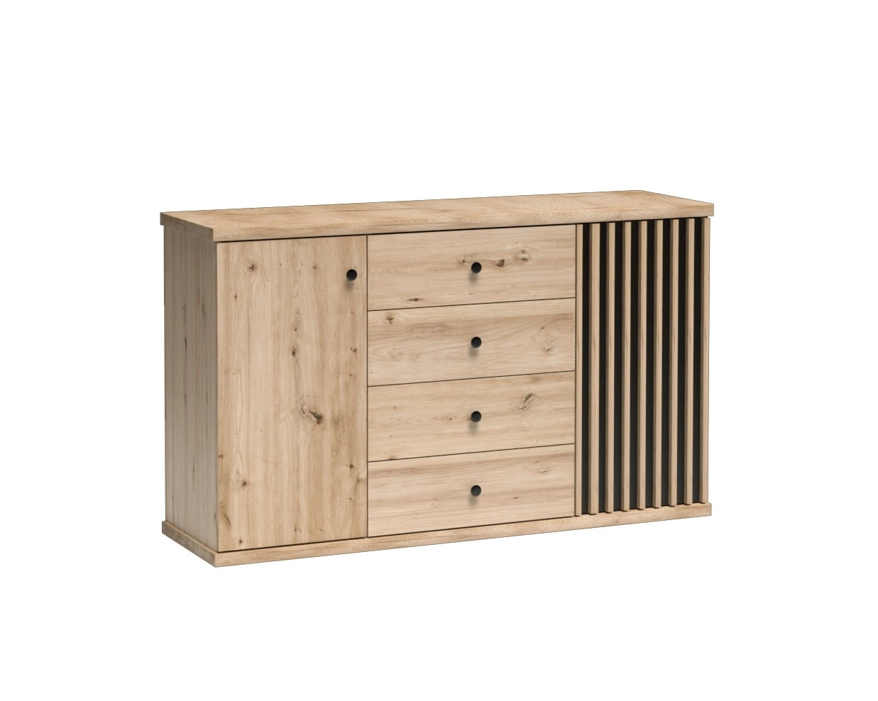 Komoda z szufladami Cali 142 cm dąb artisan / czarny elegancki i uniwersalny styl komody czarne uchwyty ozdobne lamele na drzwiach komody