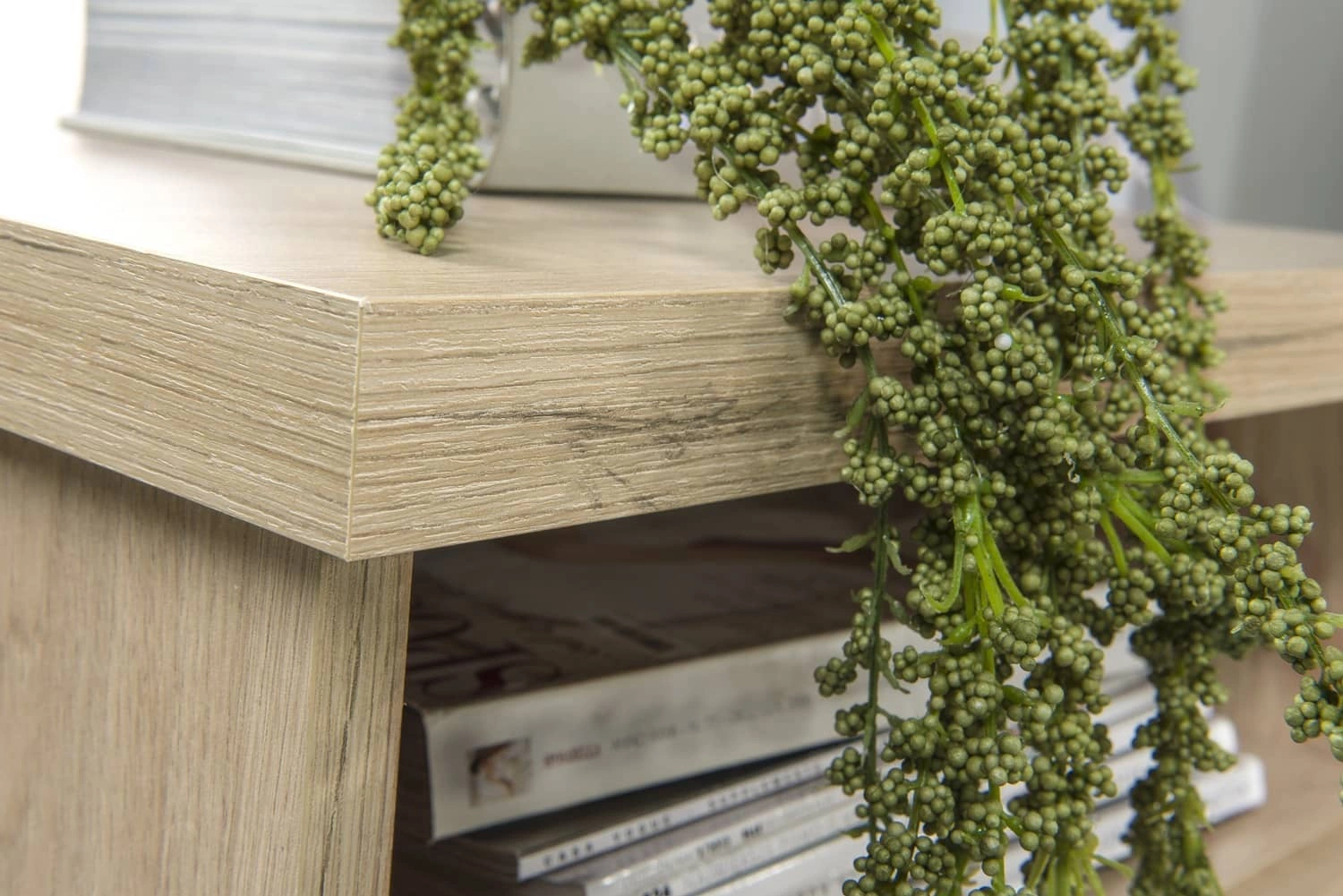 Szafka pod telewizor jest skonstruowana z 2 szuflad, 1 drzwi z systemem cichego domykania oraz półek otwartych. Wnęki w szafce są świetnym miejscem na sprzęt rtv lub konsolę do gier. Szafka pod telewizor gwarantuje komfortowe i bezproblemowe korzystanie oraz trwałość całego mebla przez wiele lat użytkowania. Ciepły odcień dębu nada pomieszczeniu lekkości i przytulnego klimatu, dzięki czemu szafki RTV Cali świetnie sprawdzą się w przestronnych, jasnych wnętrzach w stylu nowoczesnym. Szafki RTV nowoczesne oraz szafki RTV industrialne o eleganckim wykończeniu idealnie dopasują się do każdej aranżacji.