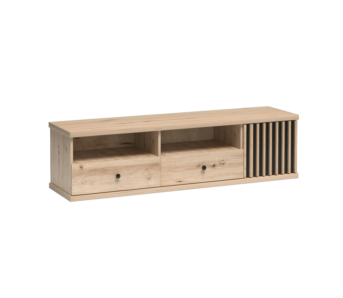 Szafka RTV Cali 160 cm dąb artisan / czarny elegancki styl szafki pod telewizor czarne uchwyty ozdobne lamele na drzwiach pojemne szuflady