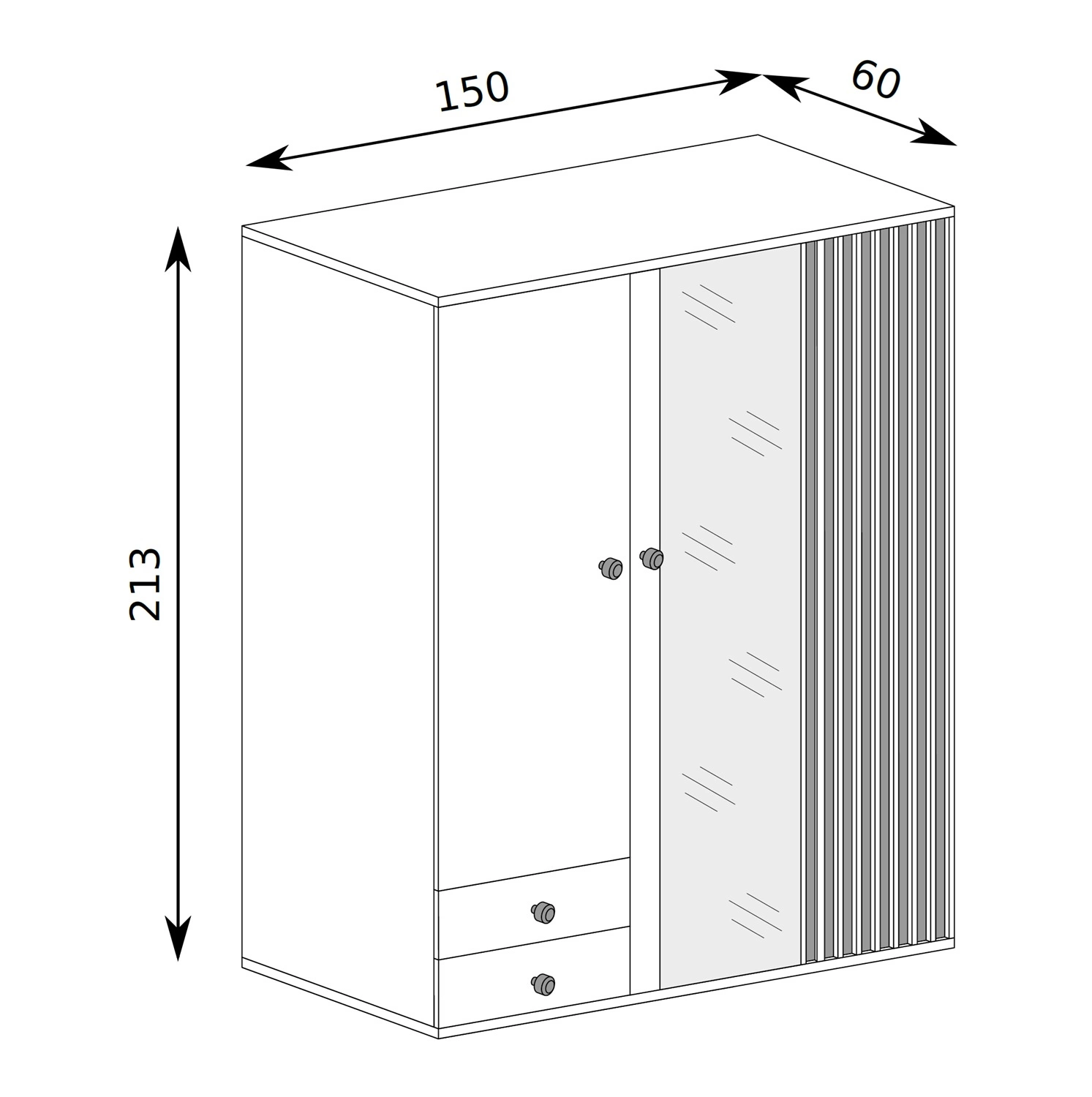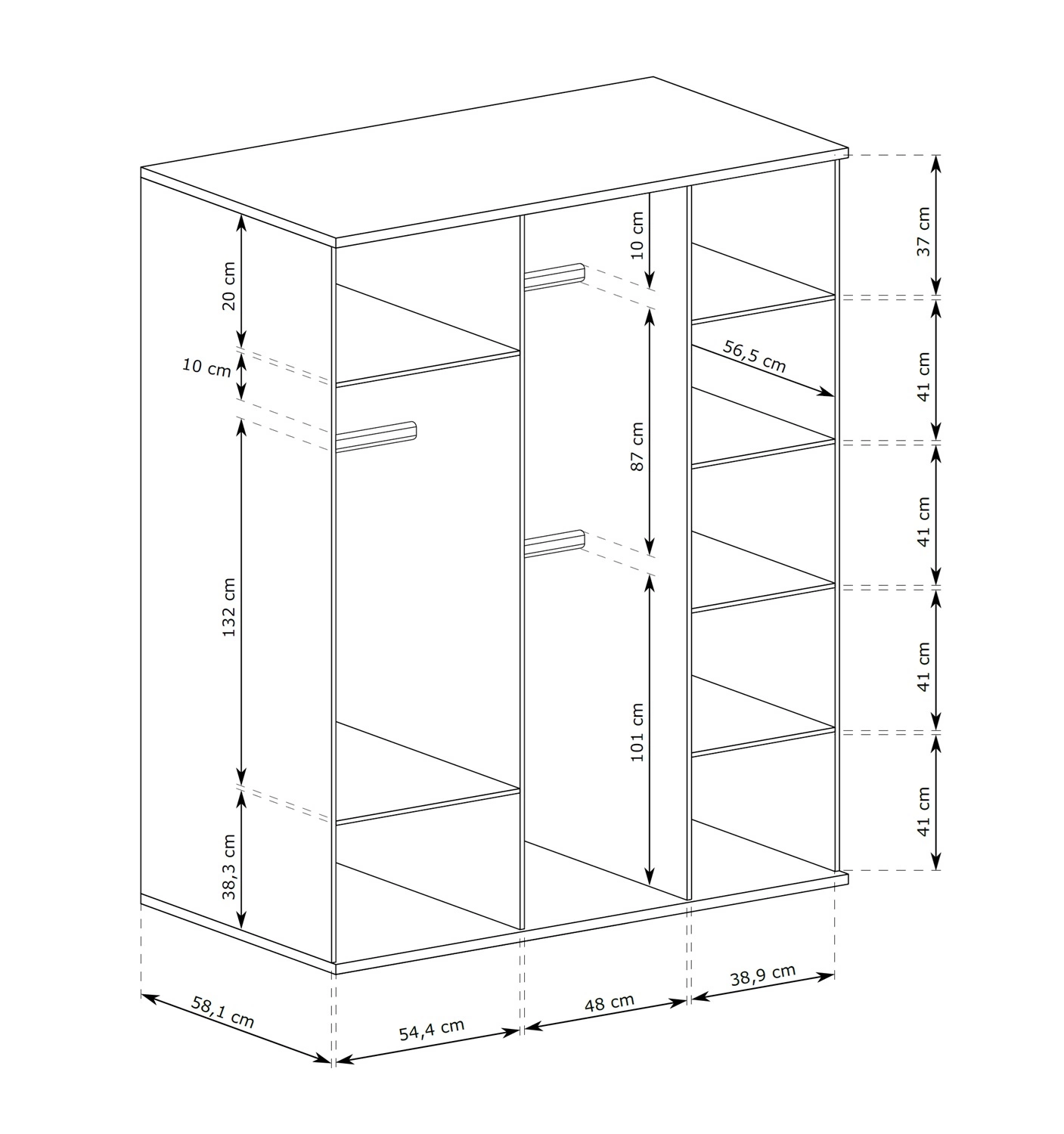 Szafa jest skonstruowana z 3 drzwi oraz 2 szuflad. Szafa z lustrem gwarantuje komfortowe i bezproblemowe korzystanie oraz trwałość całego mebla przez wiele lat użytkowania. Modne połączenie kolorystyczne sprawia, że szafa na ubrania z powodzeniem sprawdzi się jako szafa do sypialni, jako szafa do przedpokoju lub szafa do pokoju dziecięcego. Szafy z lustrem Cali doskonale sprawdzi się także w roli garderoby do przedpokoju.