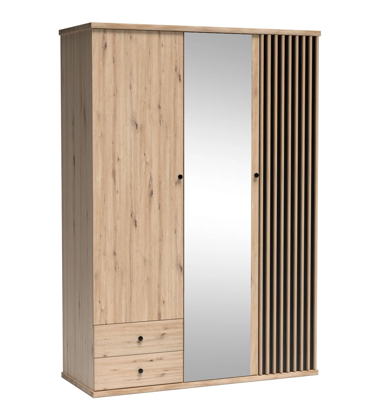 Szafa z lustrem Cali 150 cm dąb artisan / czarny drzwi szafy ozdobione lamelami w kolorze dębu czarne uchwyty szafa z szufladami