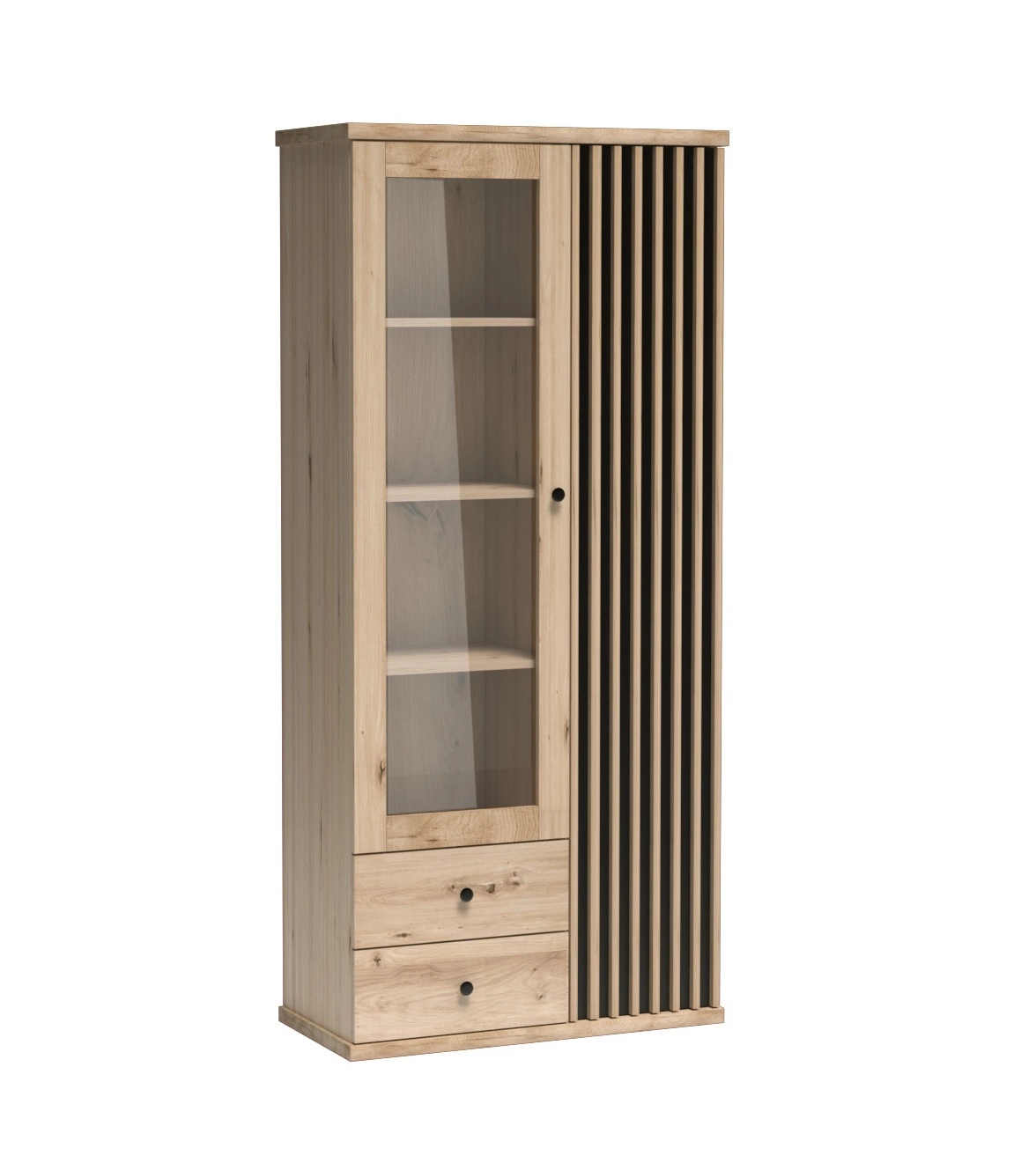 Zestaw mebli do salonu Cali dąb artisan / czarny meblościanka z ozdobnymi lamelami i czarnymi uchwytami