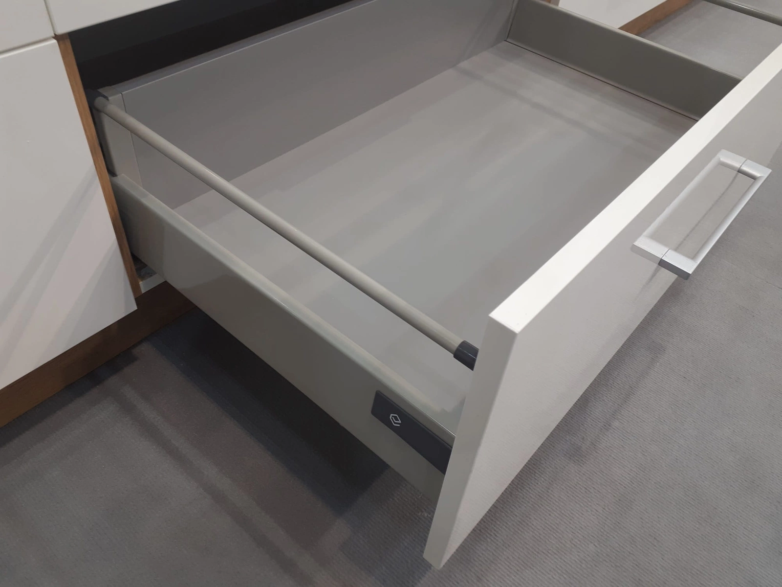 Szuflady Premium Box charakteryzują się zwiększoną wytrzymałością, dzięki czemu szafkę można wypełnić po brzegi przyborami i akcesoriami kuchennymi. System cichego domykania szuflad zwiększa komfort i bezpieczeństwo użytkowania mebli. Szafka kuchenna jest wyposażona w regulowane nogi, które zapewniają stabilne ustawienie szafki.