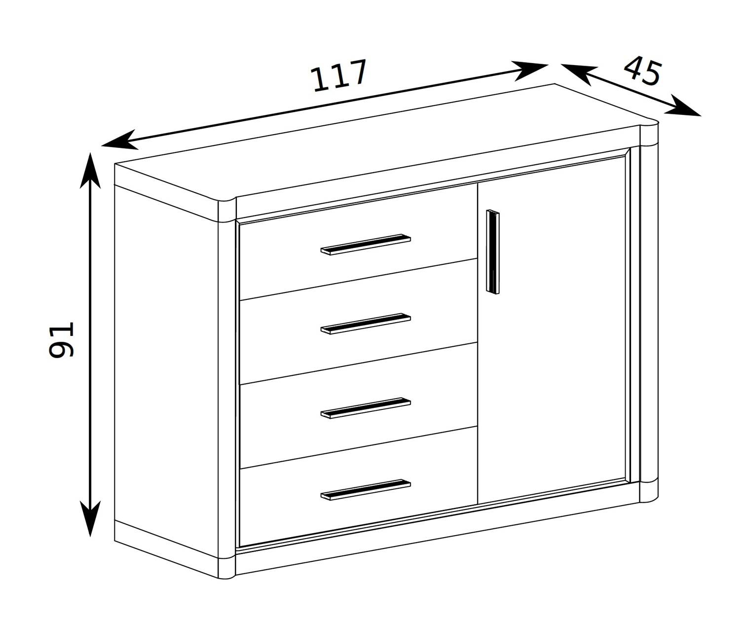 Komoda do salonu skonstruowana jest z 1 drzwi oraz 4 szuflad. Komoda do salonu gwarantuje komfortowe i bezproblemowe korzystanie oraz trwałość całego mebla przez wiele lat użytkowania. Ciepłe wybarwienie dębu nada pomieszczeniu lekkości i przytulnego klimatu, dzięki czemu komoda z szufladami Dallas świetnie sprawdzi się w roli komody do salonu lub komody do pokoju dziennego. Komoda z powodzeniem odnajdzie się także jako mebel biurowy lub komoda do sypialni.