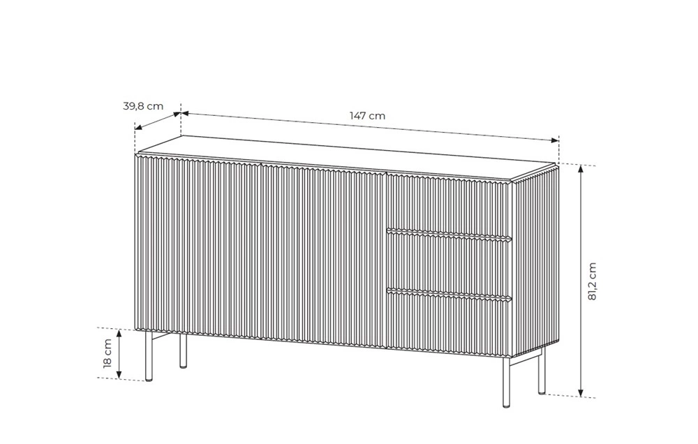 Komoda z szufladami z kolekcji Muti to nowoczesny mebel utrzymany w prostym, a zarazem oryginalnym stylu. Klasyczna czerń nada pomieszczeniu elegancji, wyrazistości, a także niepowtarzalnego klimatu. Cechą wyróżniającą kolekcję mebli Muti są efektowne ryflowania na frontach i korpusie, dzięki którym kolekcja doskonale wpisuje się w aktualne trendy wnętrzarskie. Całości dopełniają metalowe, czarne nogi podkreślając elegancką stylistykę komody. Unikatowe wzornictwo komody z szufladami spełni oczekiwania miłośników odważnych, a także wyrafinowanych aranżacji.