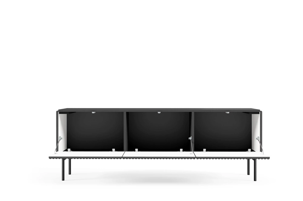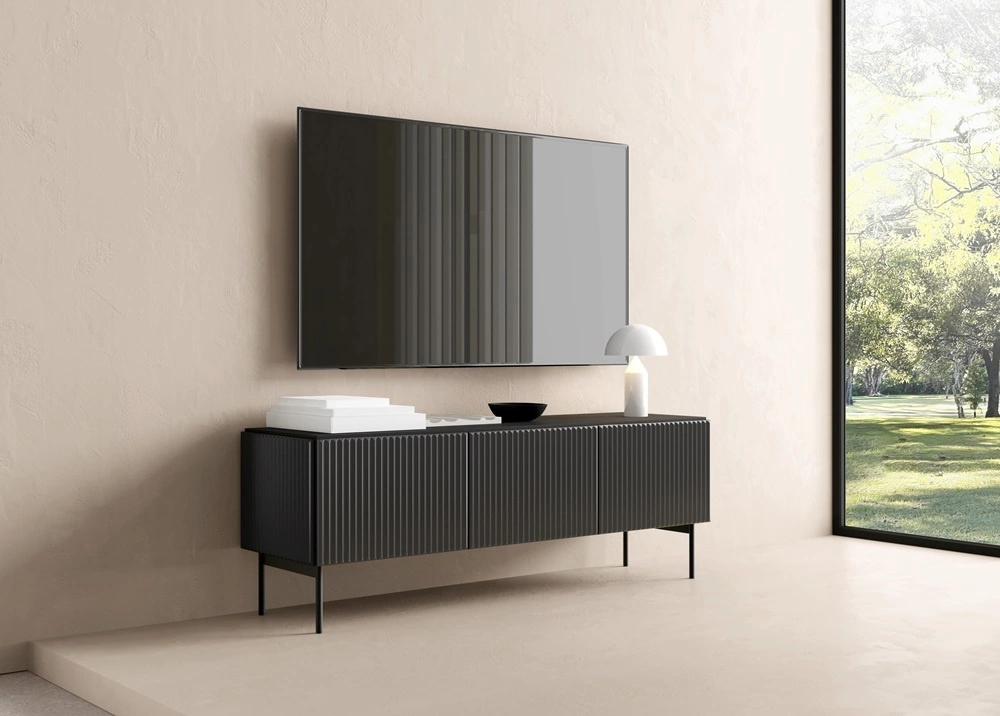 Szafka została skonstruowana z 3 praktycznych klap otwieranych do dołu. Ryflowane elementy szafki RTV zostały wykonane z płyty MDF o grubości 18mm, która charakteryzuje się odpornością na wpływ czynników zewnętrznych takich jak obicia, uderzenia i niefortunne zadrapania. Klasyczna czerń doskonale odnajdzie się w modnych aranżacjach, dzięki czemu szafki RTV Muti świetnie sprawdzą się w przestronnych, jasnych wnętrzach w stylu nowoczesnym. Szafki RTV nowoczesne oraz szafki RTV industrialne o eleganckim wykończeniu idealnie dopasują się do każdej aranżacji.