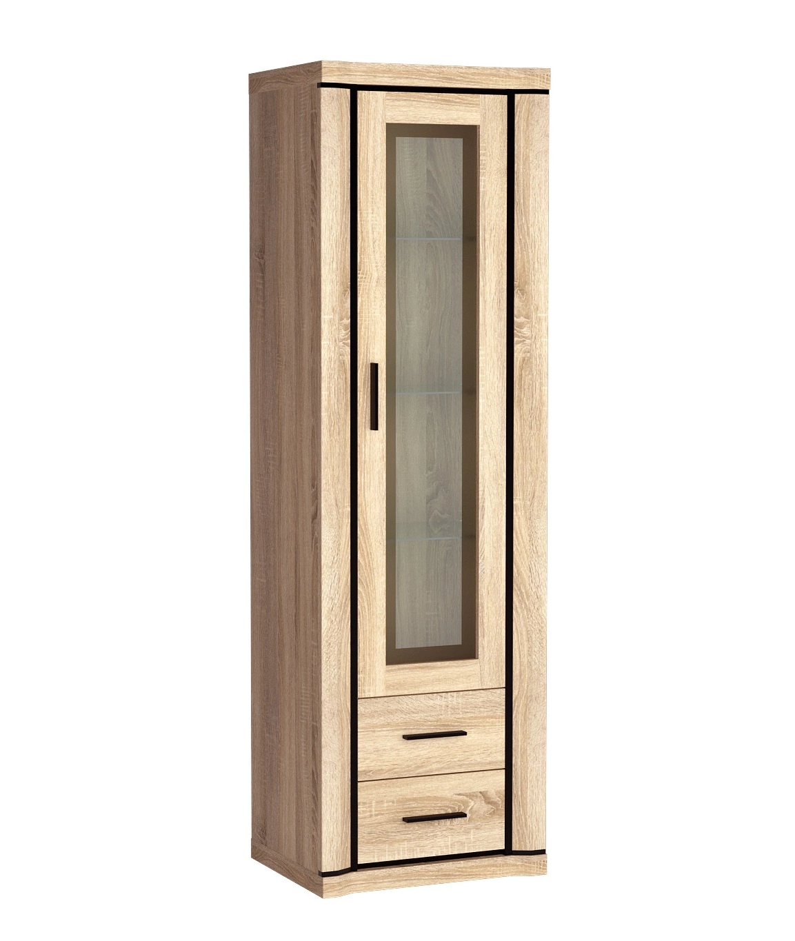 Witryna Dallas 58 cm dąb sonoma / czarny stylowa witryna z szufladami do salonu elementy z bezpiecznego szkła stylowe czarne uchwyty