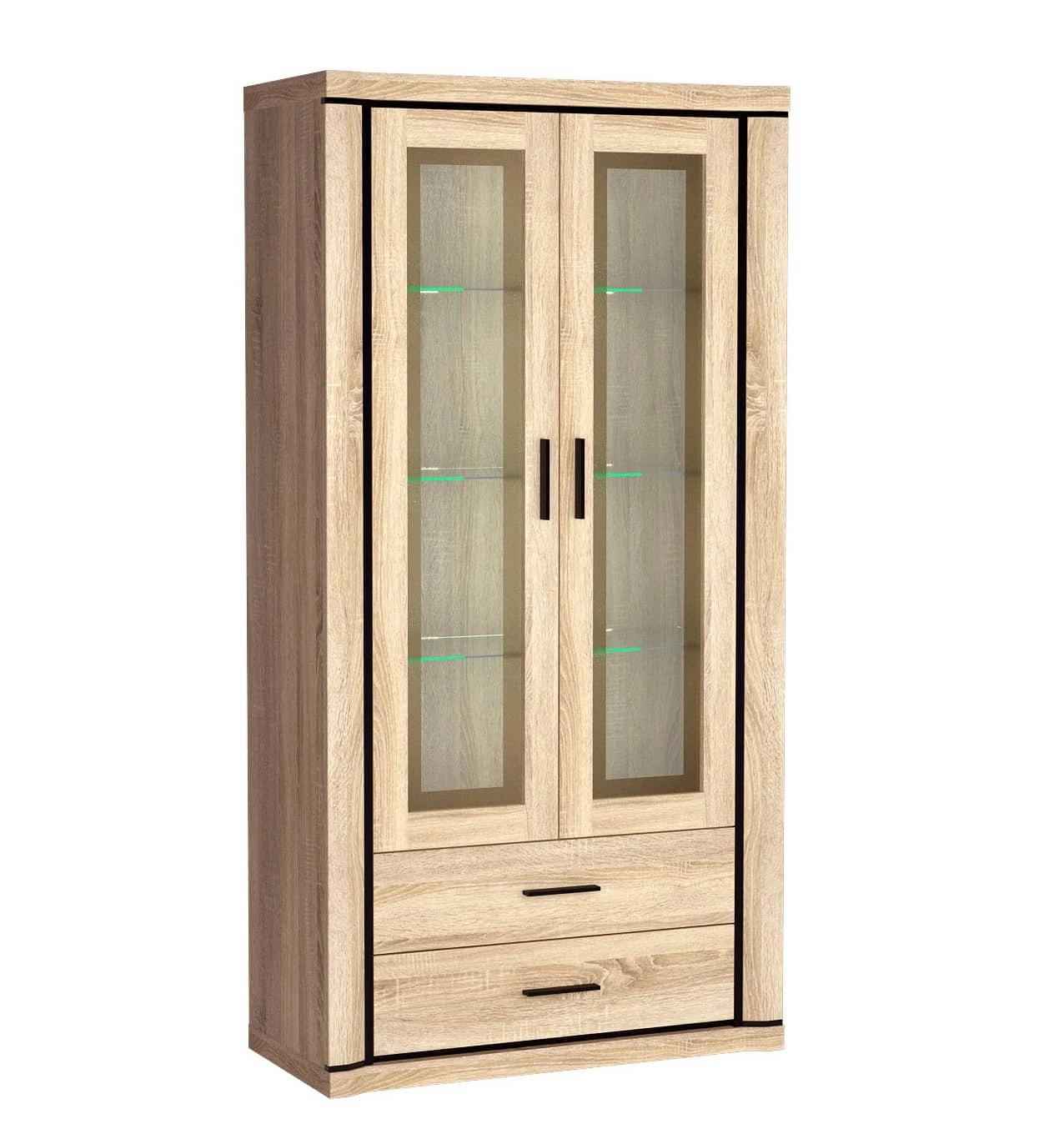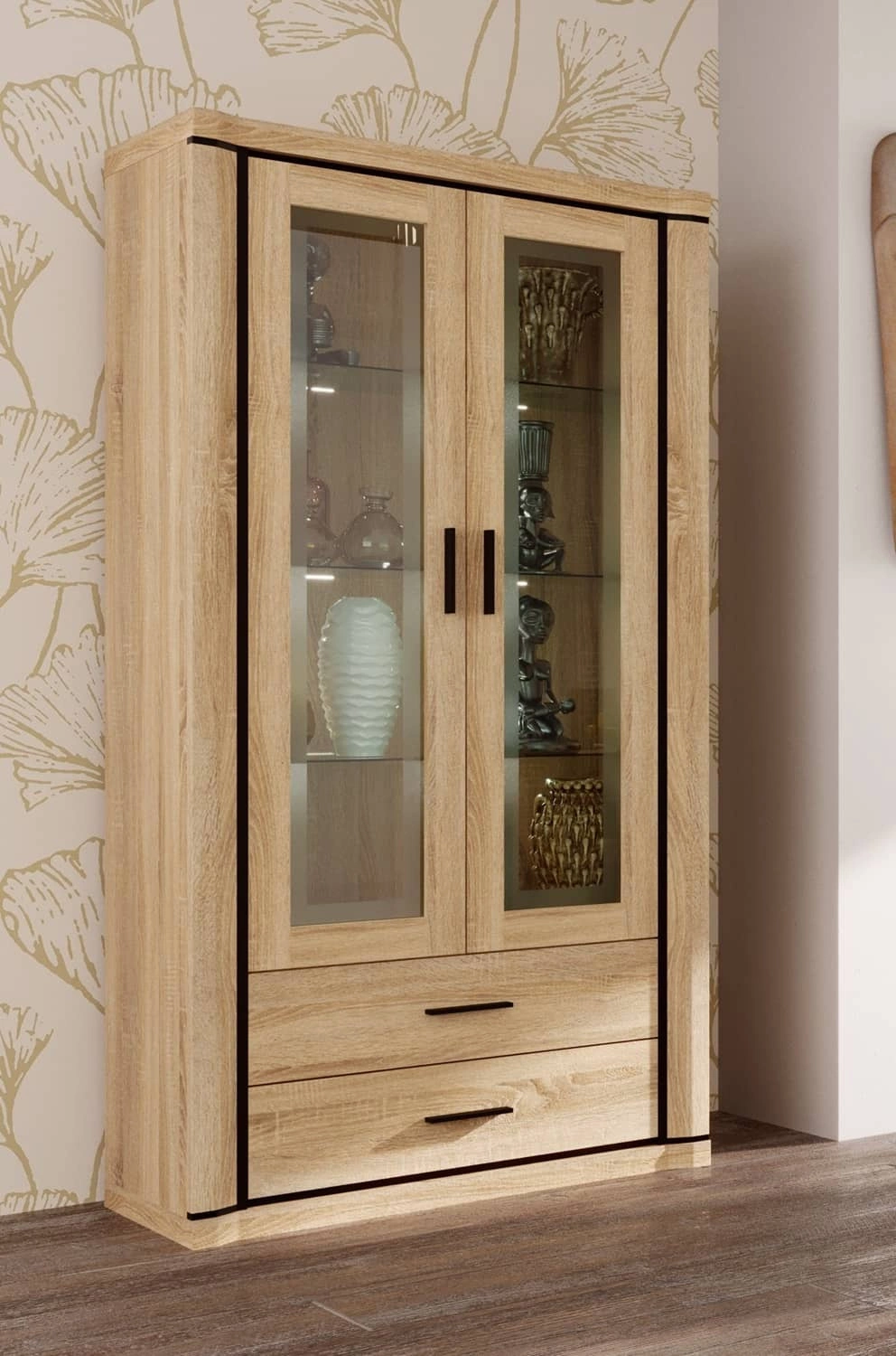 Witryna z szufladami Dallas łączy w sobie funkcjonalność z niezwykle wyjątkowym designem. Ciekawe zestawienie ciepłego dekoru drewna z wstawkami w kolorze czarnym nadaje meblom nowoczesnego wyglądu i kontrastu. Oryginalny kształt mebli oraz uchwyty wykonane z solidnego tworzywa w kolorze czarnym to element, który przyciągają wzrok i sprawia, że całość prezentuje się bardzo gustownie. Witryna z szufladami Dallas z powodzeniem odnajdzie się we wnętrzach w stylu klasycznym czy nowoczesnym.
