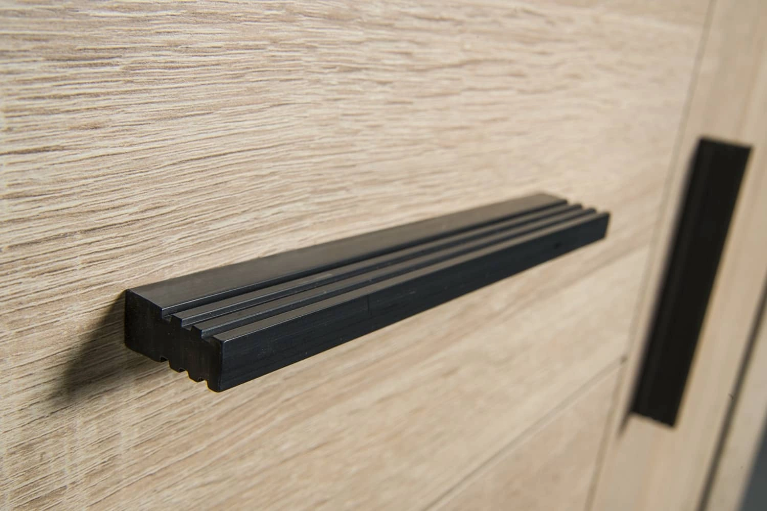Szafa Dallas łączy w sobie funkcjonalność z niezwykle wyjątkowym designem. Ciekawe zestawienie ciepłego dekoru drewna z wstawkami w kolorze czarnym nadaje meblom nowoczesnego wyglądu i kontrastu. Oryginalny kształt mebli oraz uchwyty wykonane z solidnego tworzywa w kolorze czarnym to element, który przyciągają wzrok i sprawia, że całość prezentuje się bardzo gustownie. Szafa na ubrania Dallas z powodzeniem odnajdzie się we wnętrzach w stylu klasycznym jak i nowoczesnym.