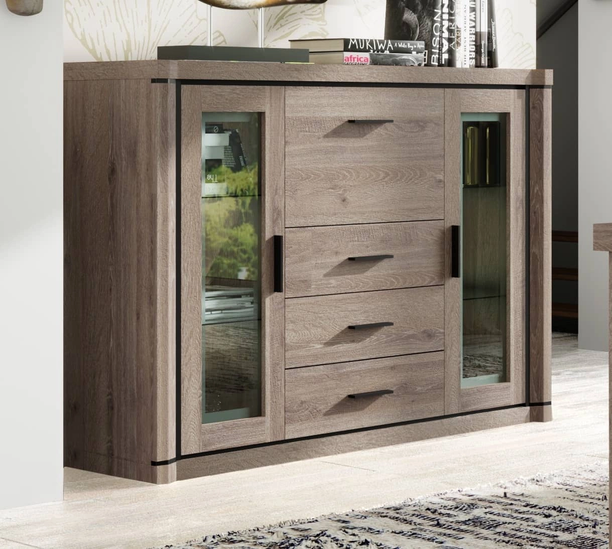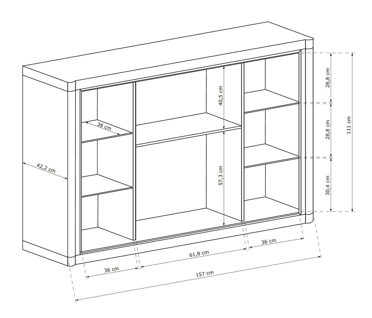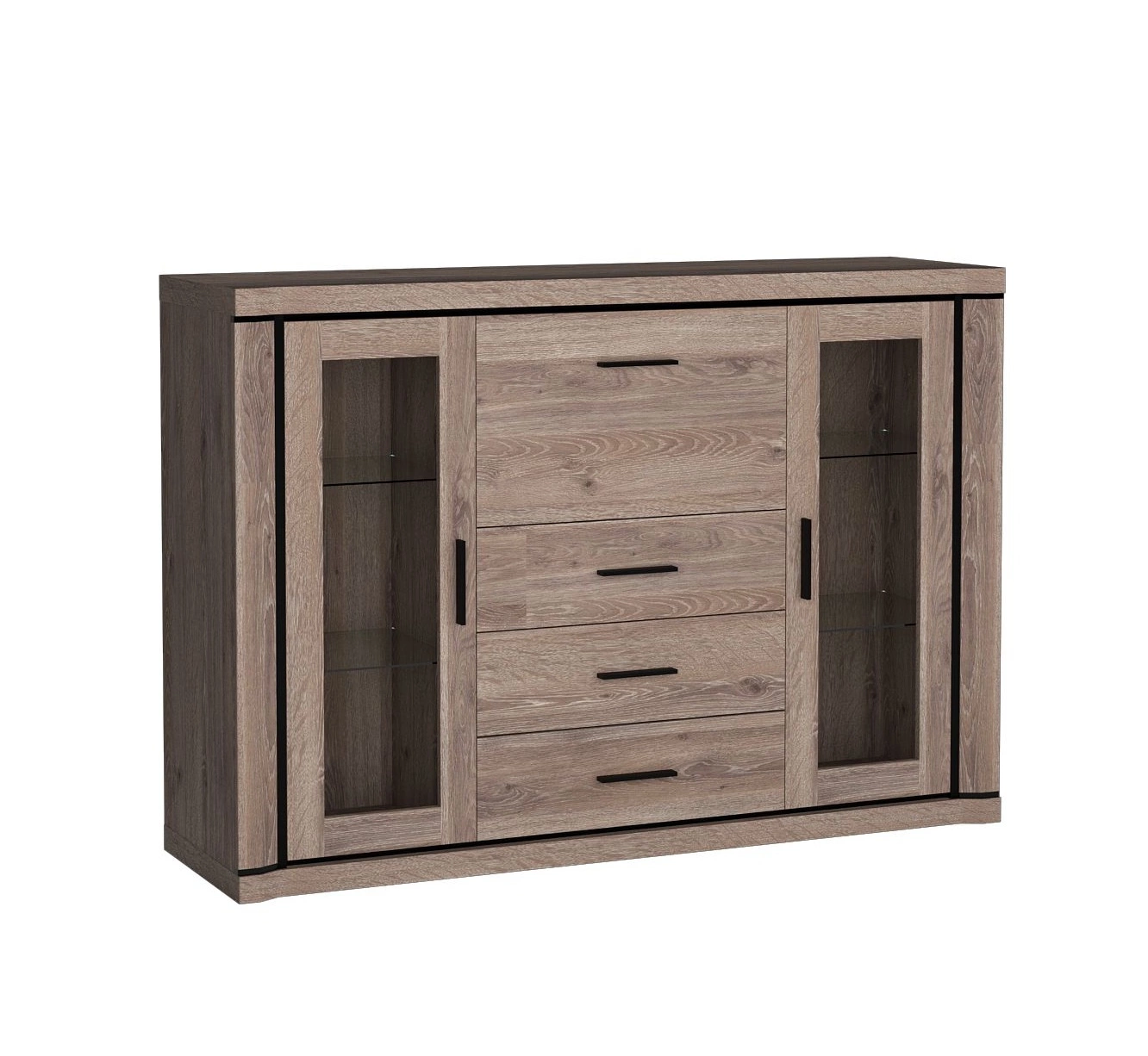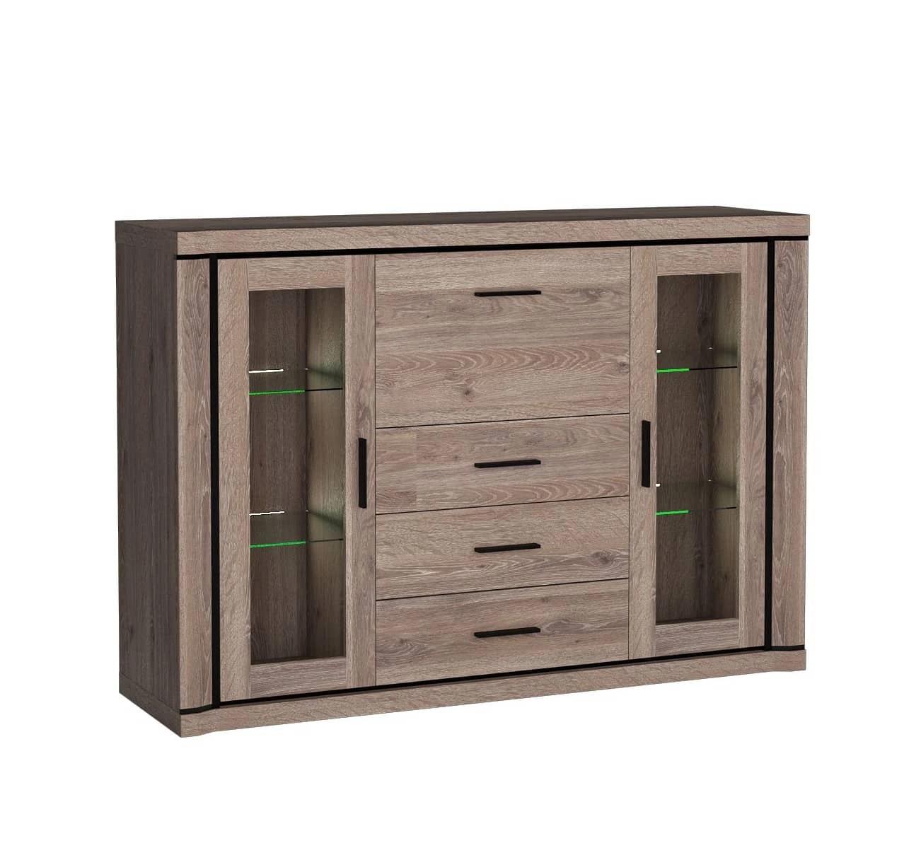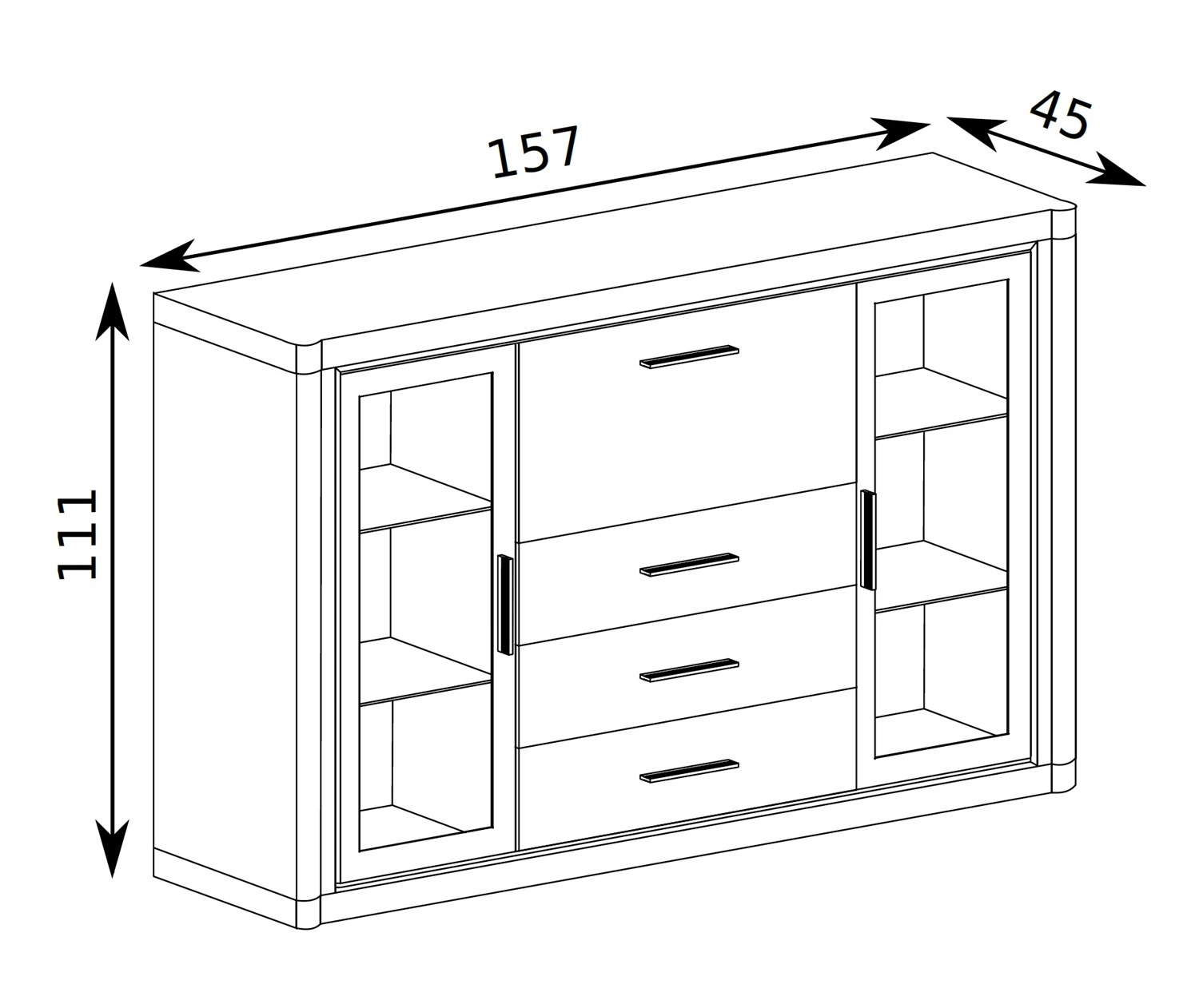 Komoda do salonu wykonana została z wysokiej jakości płyty laminowanej, która charakteryzuje się odpornością na wpływ czynników zewnętrznych takich jak obicia, uderzenia i niefortunne zadrapani. Przeszklony front pozwala na swobodne wyeksponowanie prezentowanych elementów stanowiących ozdobę pomieszczenia. Pojemne szuflady oraz zamykane szafki pomieszczą wszystkie rzeczy oraz niezbędne akcesoria. Przeszklone fronty oraz szklane półki wykonane są z bezpiecznego szkła hartowanego.