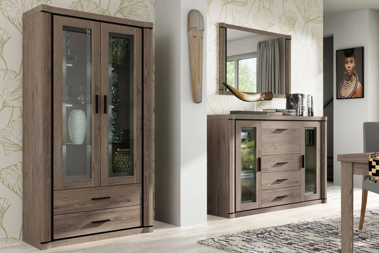 Komoda z szufladami z kolekcji Dallas łączy w sobie funkcjonalność z niezwykle wyjątkowym designem. Ciekawe zestawienie ciemnego dekoru drewna z wstawkami w kolorze czarnym nadaje meblom nowoczesnego wyglądu i kontrastu. Oryginalny kształt mebli oraz uchwyty wykonane z solidnego tworzywa w kolorze czarnym to element, który przyciągają wzrok i sprawia, że całość prezentuje się bardzo gustownie. Komoda z szufladami Dallas z powodzeniem odnajdzie się we wnętrzach w stylu klasycznym czy nowoczesnym.