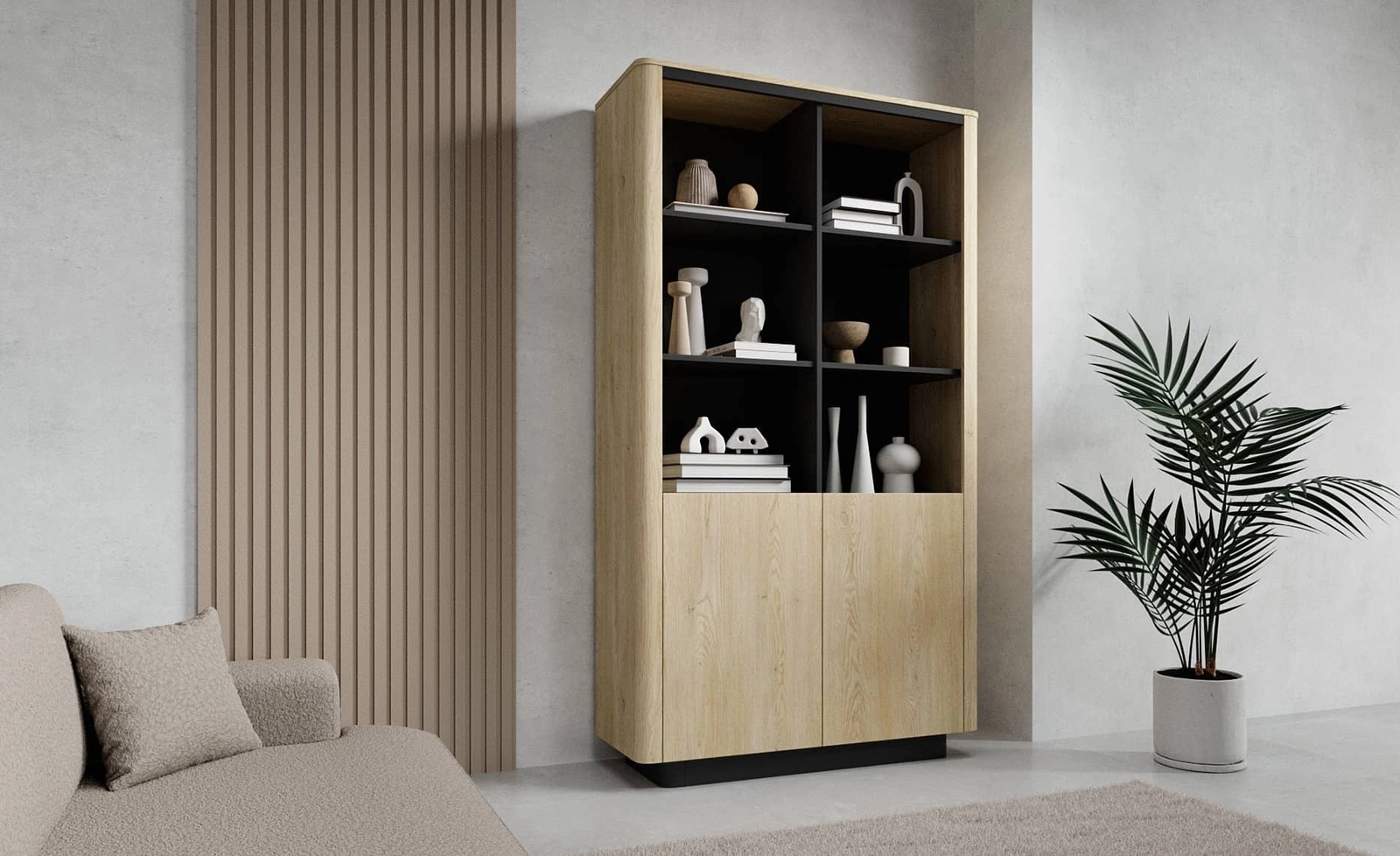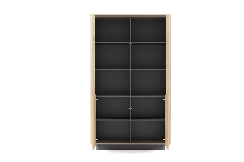 Regał do salonu jest skonstruowany z otwartych półek oraz 2 drzwi. Wyposażenie regału w system push to open gwarantuje komfortowe otwieranie, a jednocześnie pozwala na zachowanie nowoczesnego i minimalistycznego charakteru. Regał do pokoju gwarantuje komfortowe i bezproblemowe korzystanie oraz trwałość całego mebla przez wiele lat użytkowania. Jasny odcień dębu cremona w połączeniu z czernią świetnie odnajdzie się w modnych aranżacjach, dzięki czemu regały na książki z kolekcji Torro świetnie sprawdzą się jako regał do salonu, regał biurowy lub regał do pokoju dziennego.
