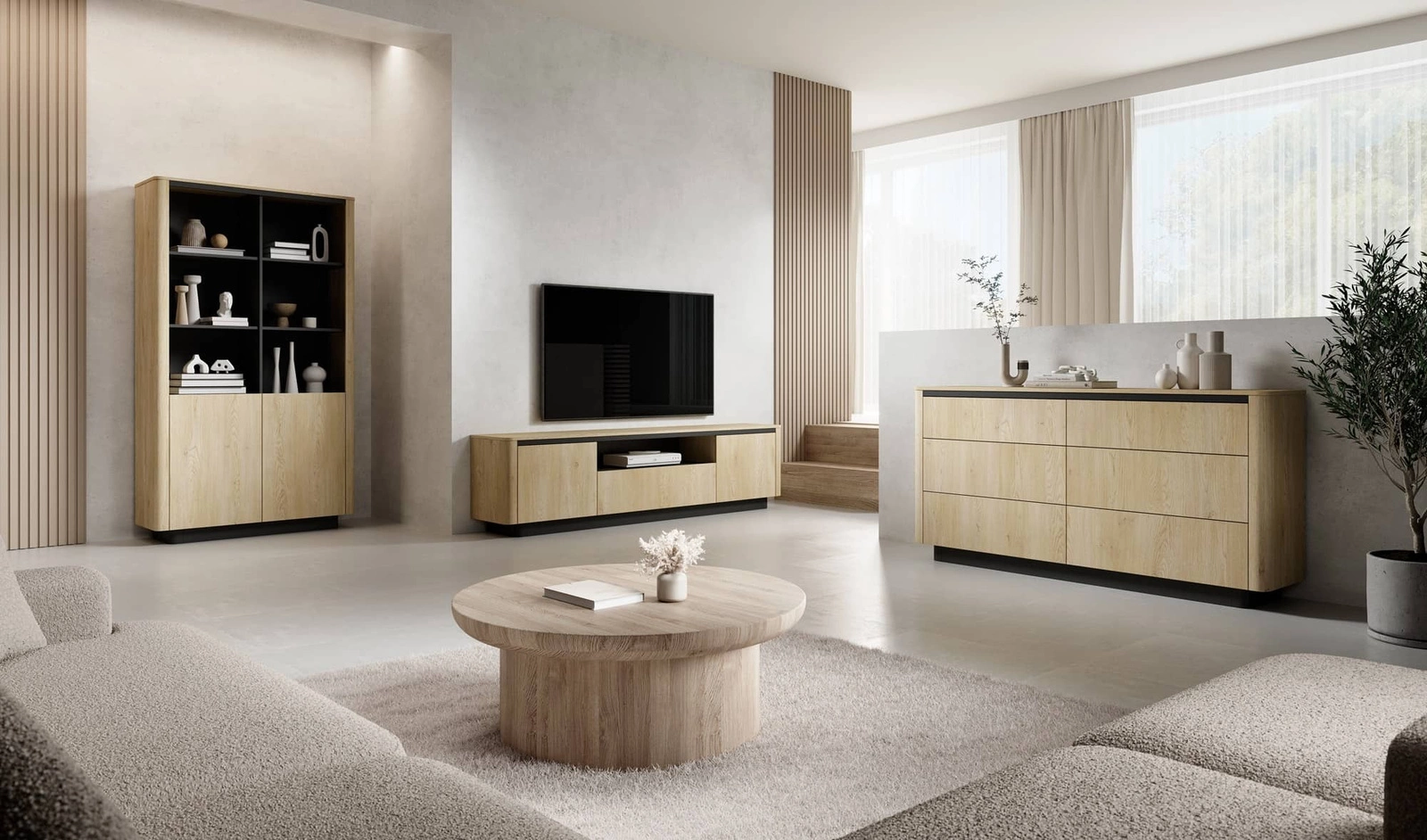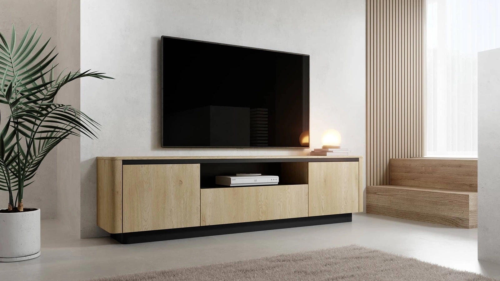 Szafka pod telewizor Torro to funkcjonalny i unikatowy mebel, nawiązujący do przytulności i minimalizmu stylu japandi. Jasny odcień dębu cremona doskonale współgra z czarnymi elementami mebla, zyskując bardziej wyrazisty i nowoczesny charakter. Bezuchwytowe fronty, a także zastosowana na bokach zaoblona listwa dodaje kolekcji lekkości i delikatności, natomiast ozdobna listwa pod blatem oraz cokół w kontrastowym czarnym kolorze podkreśla elegancję i oryginalność. Proste linie i uproszczona sylwetka tworzą estetyczny design, który wprowadzi do wnętrz przytulny klimat, zachwycając każdego zwolennika naturalnego, a zarazem ciekawego stylu.