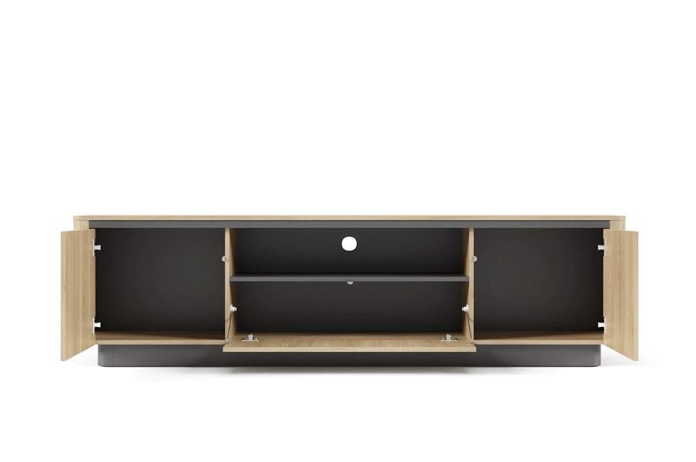 Szafka RTV jest skonstruowana z 3 drzwi. Wyposażenie szafki RTV w system push to open gwarantuje komfortowe otwieranie, a jednocześnie pozwala na zachowanie nowoczesnego i minimalistycznego charakteru. Szafka pod telewizor gwarantuje komfortowe i bezproblemowe korzystanie oraz trwałość całego mebla przez wiele lat użytkowania. Jasny odcień dębu cremona w połączeniu z czernią świetnie odnajdzie się w modnych aranżacjach, dzięki czemu szafki RTV świetnie sprawdzą się w przestronnych, jasnych wnętrzach w stylu minimalistycznym. Szafki RTV nowoczesne, szafki RTV skandynawskie oraz szafki RTV industrialne o eleganckim wykończeniu idealnie dopasują się do każdej aranżacji.