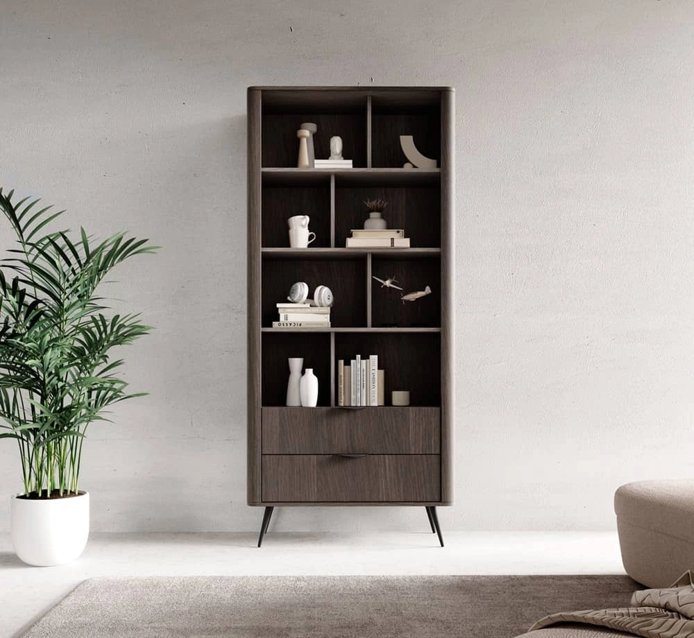 Regał Veris to przepis na wnętrza, w których piękno spotyka się z funkcjonalnością. Dzięki połączeniu głębokiego odcienia dębu dunin z czarnymi akcentami, ta pełna klasy i stylu kolekcja mebli zachwyca swoim wyjątkowym designem. Zastosowana na bokach zaoblona listwa oraz wysokie, metalowe nogi i uchwyty dodają bryłom lekkości i subtelności. Regał Veris wyróżnia również nietypowa konfiguracja półek, podkreślająca oryginalność mebla.