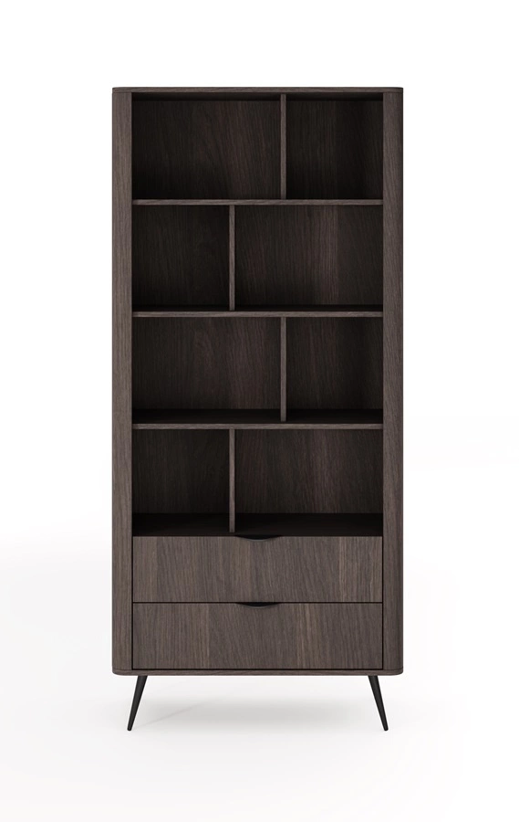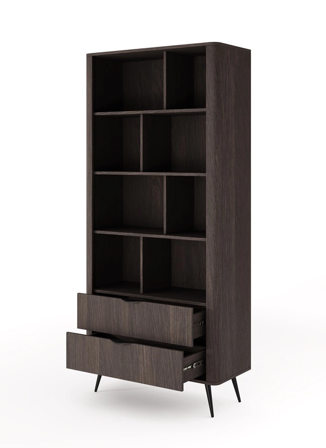 Regał do salonu jest skonstruowany z otwartych półek oraz 2 szuflad. Szuflady wzbogacono w system pełnego wysuwu, co ułatwi korzystanie z całej powierzchni bez większego problemu. Regał do pokoju gwarantuje komfortowe i bezproblemowe korzystanie oraz trwałość całego mebla przez wiele lat użytkowania. Głęboki odcień dębu dunin z czernią świetnie odnajdzie się w modnych aranżacjach, dzięki czemu regały na książki z kolekcji Veris świetnie sprawdzą się jako regał do salonu, regał biurowy lub regał do pokoju dziennego.