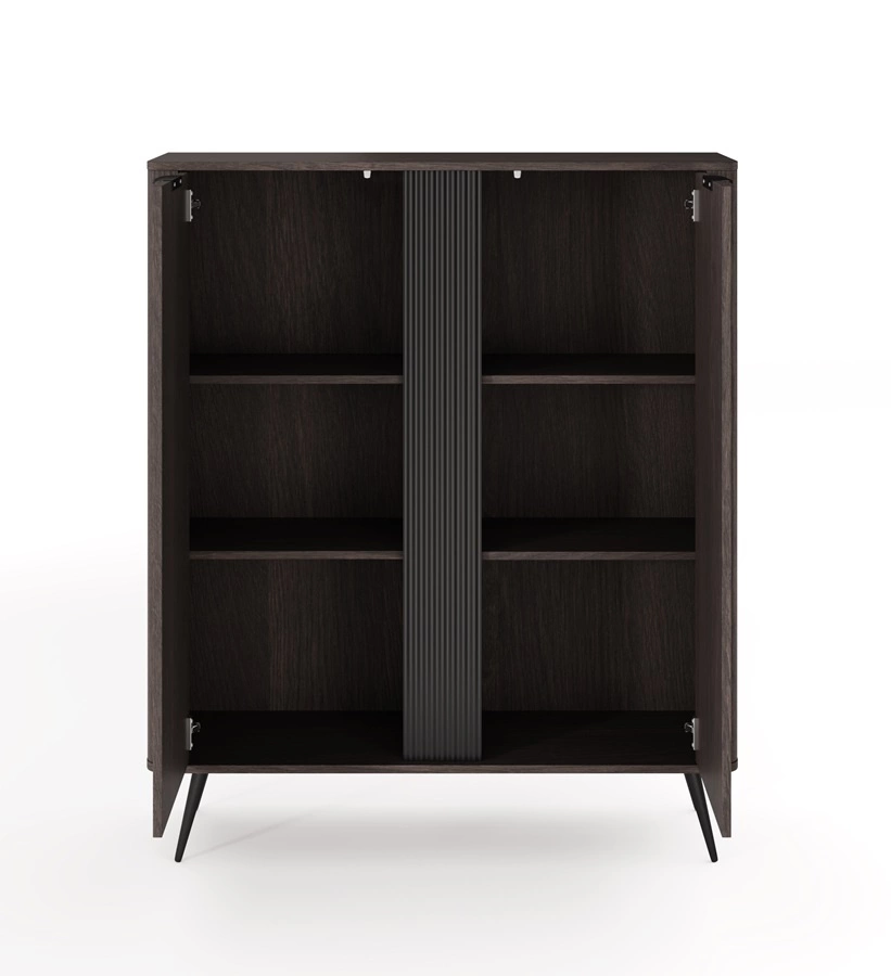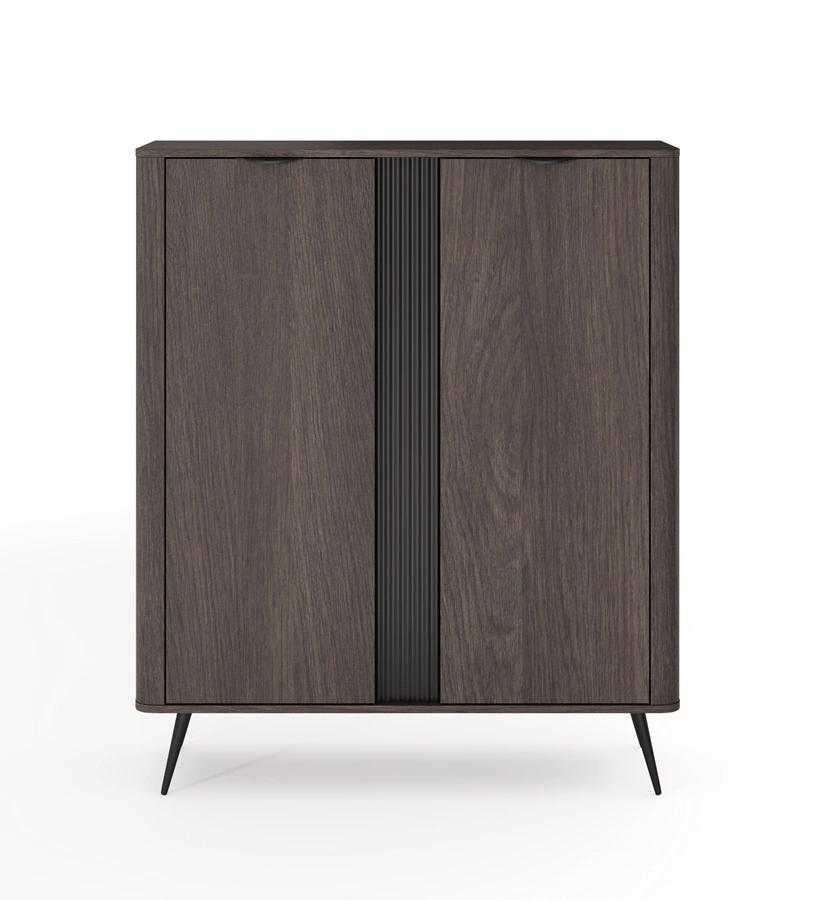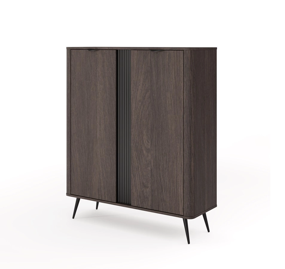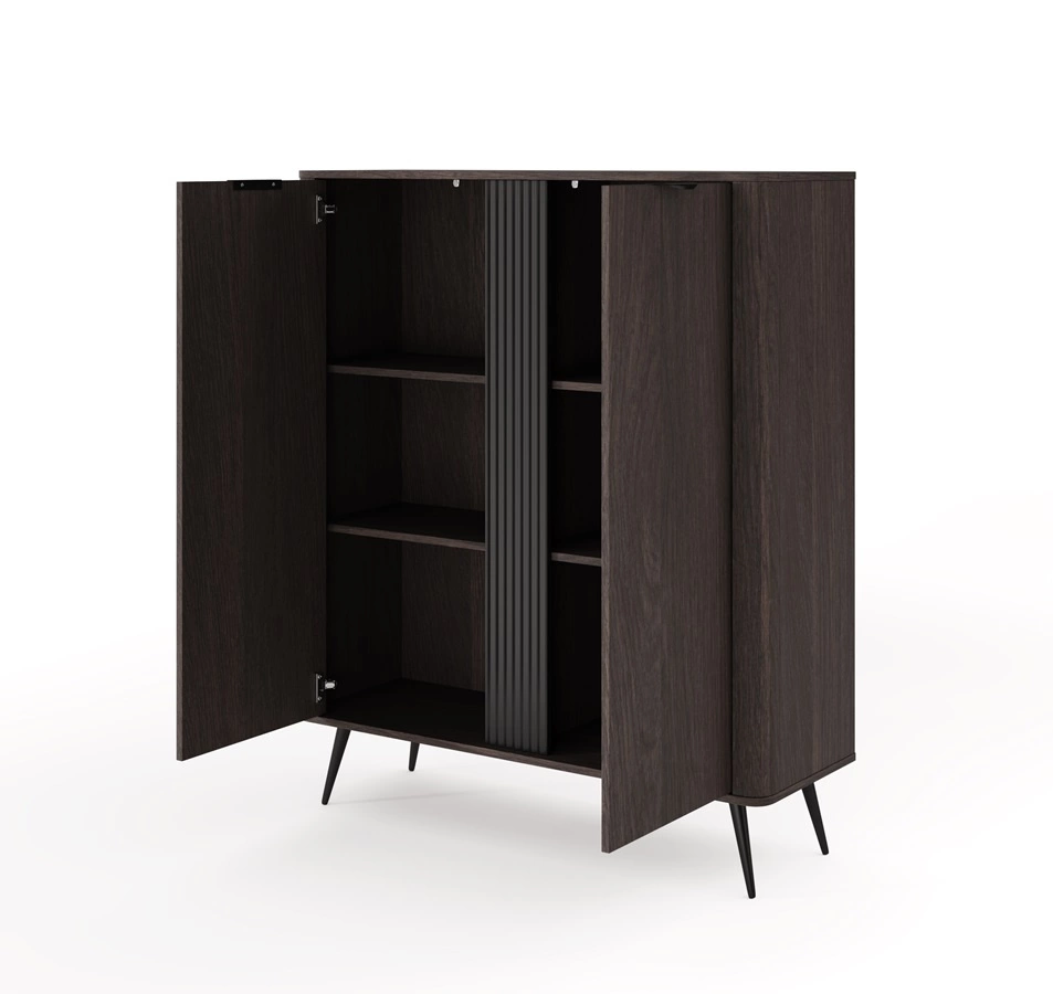 Komoda wysoka Veris to przepis na wnętrza, w których piękno spotyka się z funkcjonalnością. Dzięki połączeniu głębokiego odcienia dębu dunin z czarnymi akcentami, ta pełna klasy i stylu kolekcja mebli zachwyca swoim wyjątkowym designem. Zastosowana na bokach zaoblona listwa oraz wysokie, metalowe nogi i uchwyty dodają bryłom lekkości i subtelności. Komodę Veris wyróżnia również wyrafinowany, modny detal w postaci ozdobnej, ryflowanej listwy, podkreślającej oryginalność mebla.