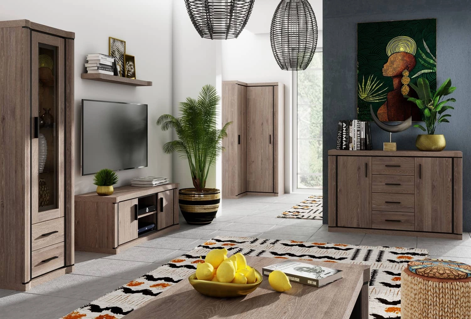 Meble do salonu Dallas zostały zaprojektowane w sposób funkcjonalny i użytkowy, oferując dużo miejsca do przechowywania. Przeszklony front witryny pozwoli wyeksponować dodatki stanowiące dekorację salonu. Wnęki w szafce RTV są świetnym miejscem na sprzęt rtv lub konsolę do gier. Szafa narożna Dallas dzieli się na część z drążkiem na ubrania wiszące oraz część z głębokimi półkami. Drewnopodobny dekor świetnie łączy się z innymi kolorami, dzięki czemu meble Dallas świetnie sprawdzą się jako meblościanka do salonu lub meblościanka do pokoju dziennego.