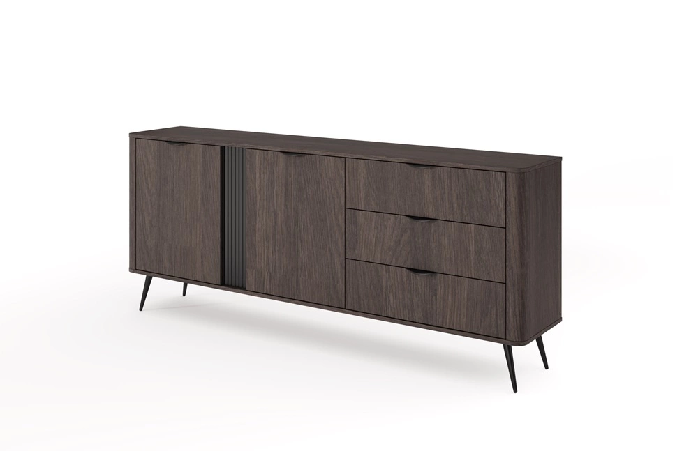 Komoda z szufladami Veris to przepis na wnętrza, w których piękno spotyka się z funkcjonalnością. Dzięki połączeniu głębokiego odcienia dębu dunin z czarnymi akcentami, ta pełna klasy i stylu kolekcja mebli zachwyca swoim wyjątkowym designem. Zastosowana na bokach zaoblona listwa oraz wysokie, metalowe nogi i uchwyty dodają bryłom lekkości i subtelności. Komodę Veris wyróżnia również wyrafinowany, modny detal w postaci ozdobnej, ryflowanej listwy, podkreślającej oryginalność mebla.
