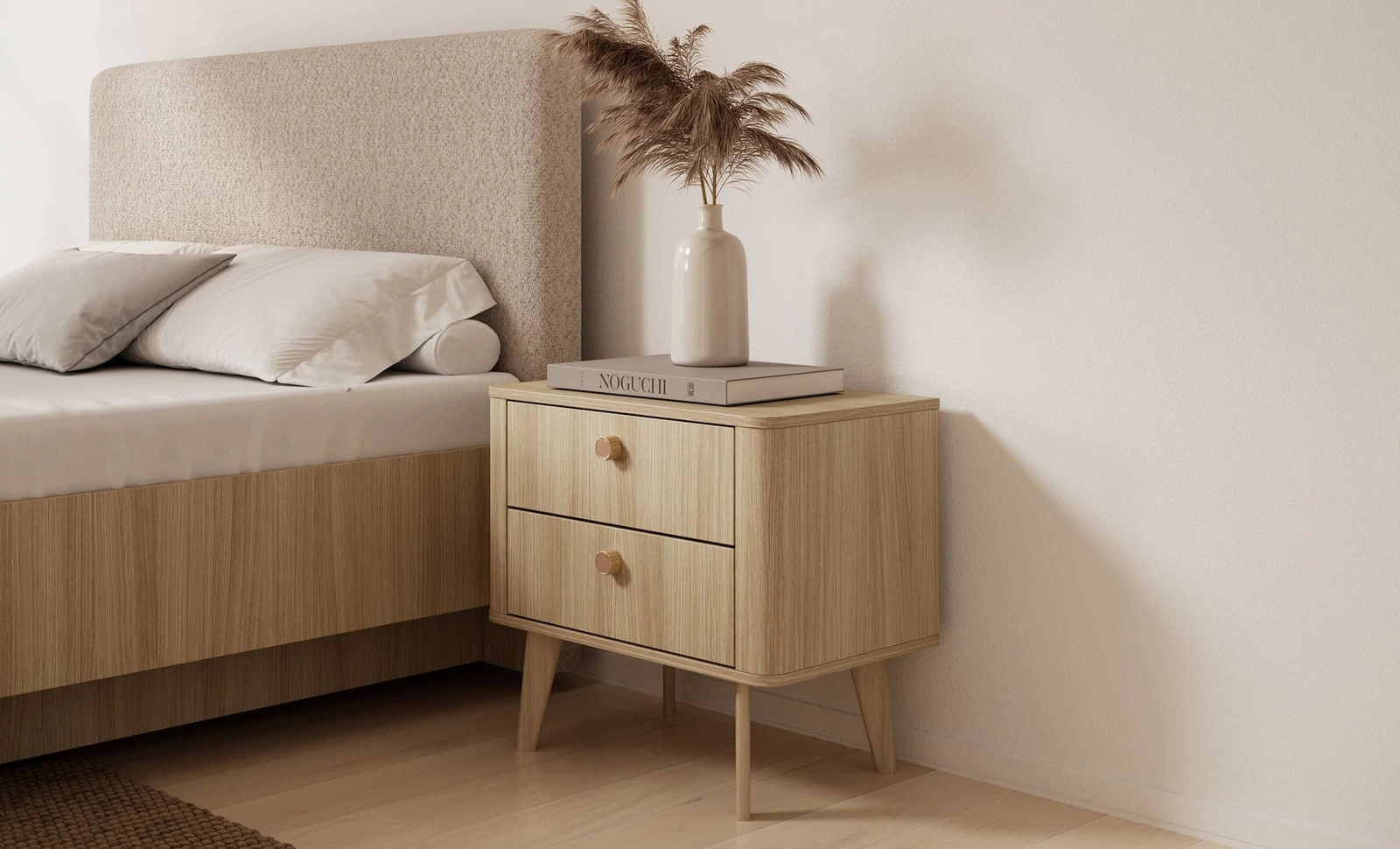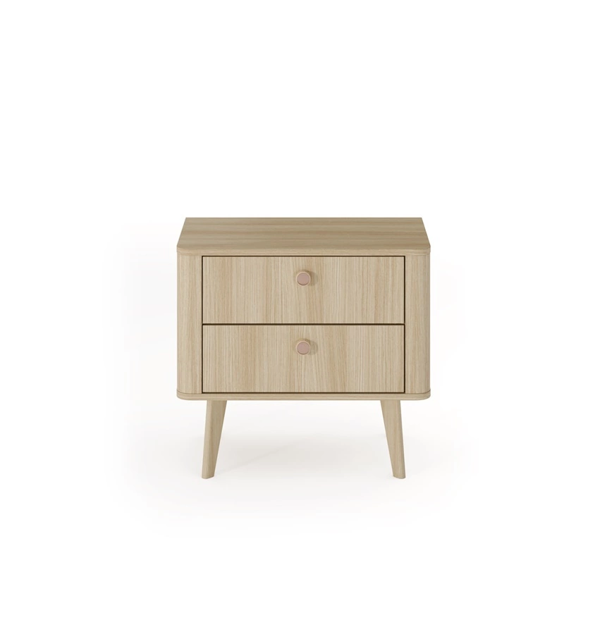 Szafka nocna Viki dąb barista nowoczesny design szafki do sypialni zaoblony kształt subtelne okrągłe uchwyty drewniane nogi