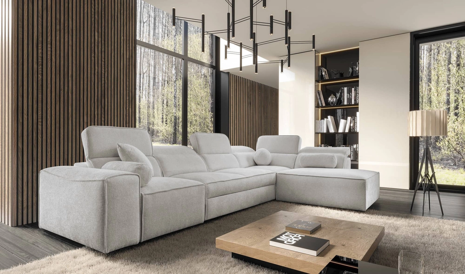Narożnik z funkcją spania Viano XI szary popiel prawostronny modny i stylowy narożnik z regulowanymi zagłówkami ozdobne poduszki